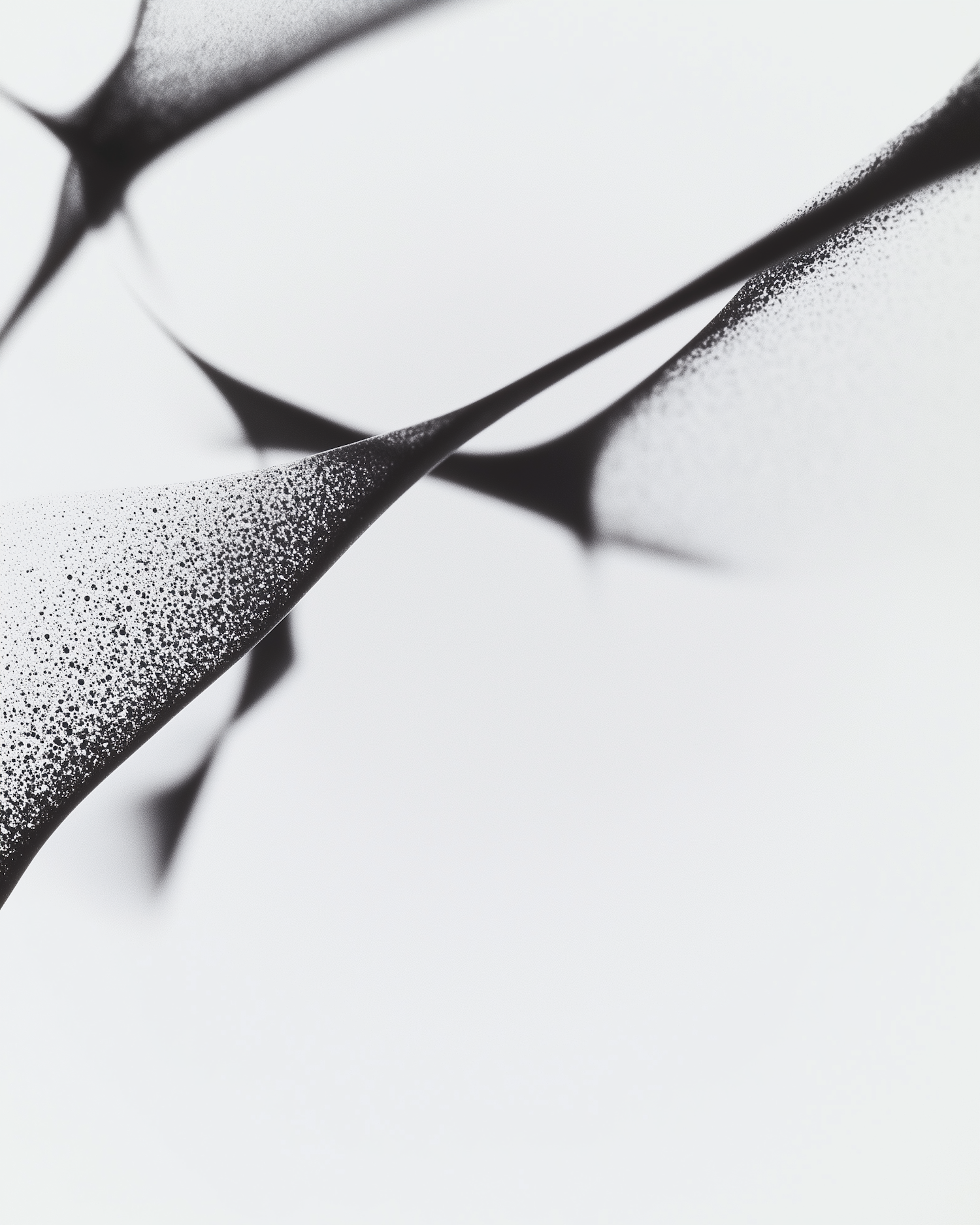 Minimalist black and white abstract art with web-like structures and dotted textures on a clean white background.