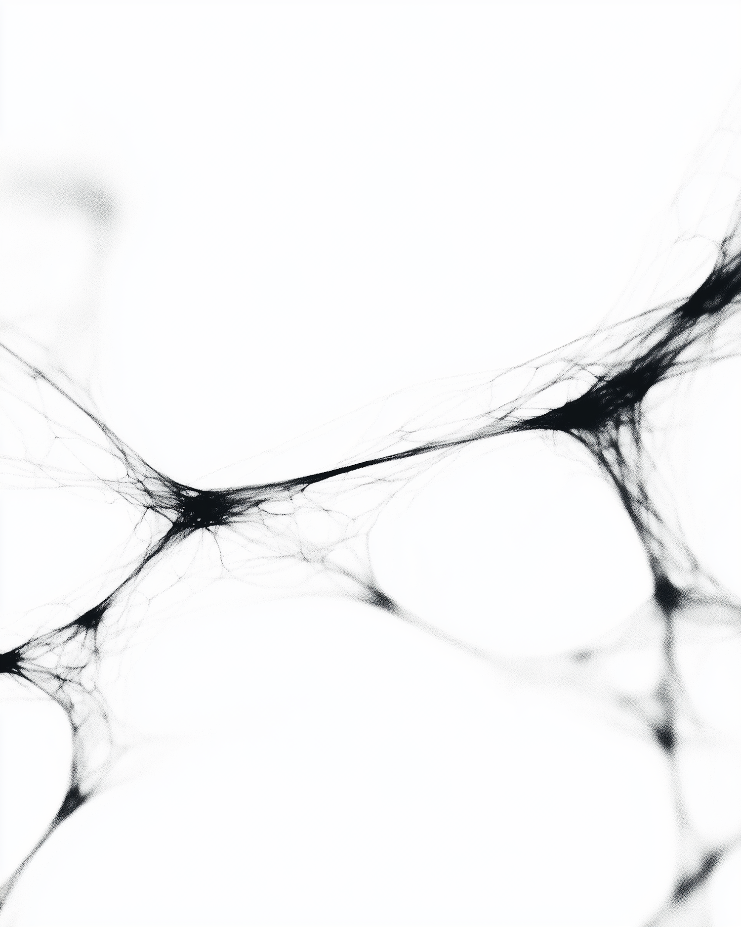 Abstract black web-like lines on a white background, forming intricate patterns and nodes, resembling a neural network or spider web.