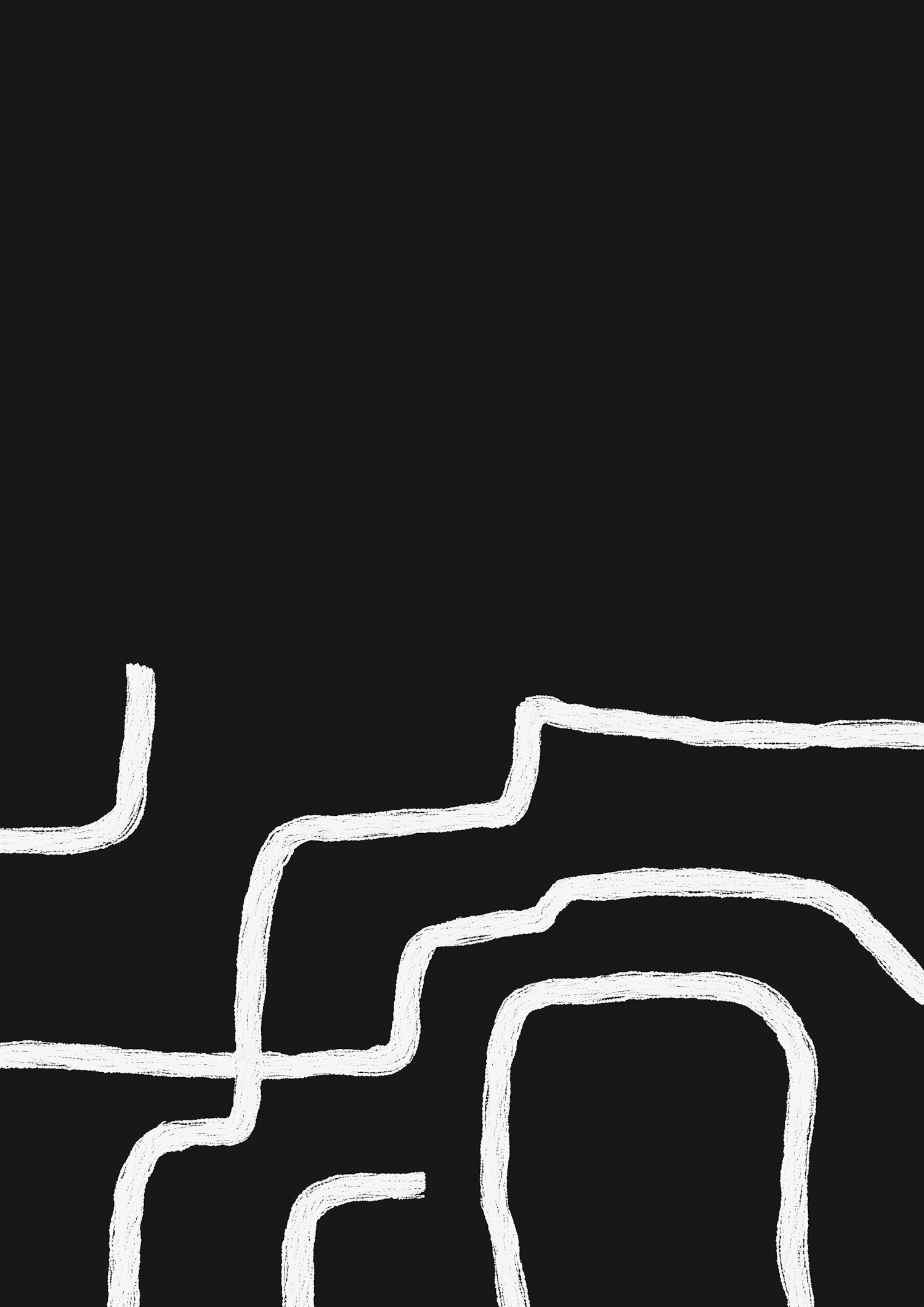 Minimalist abstract art with white hand-drawn lines on a black background, creating a maze-like interconnected pattern.