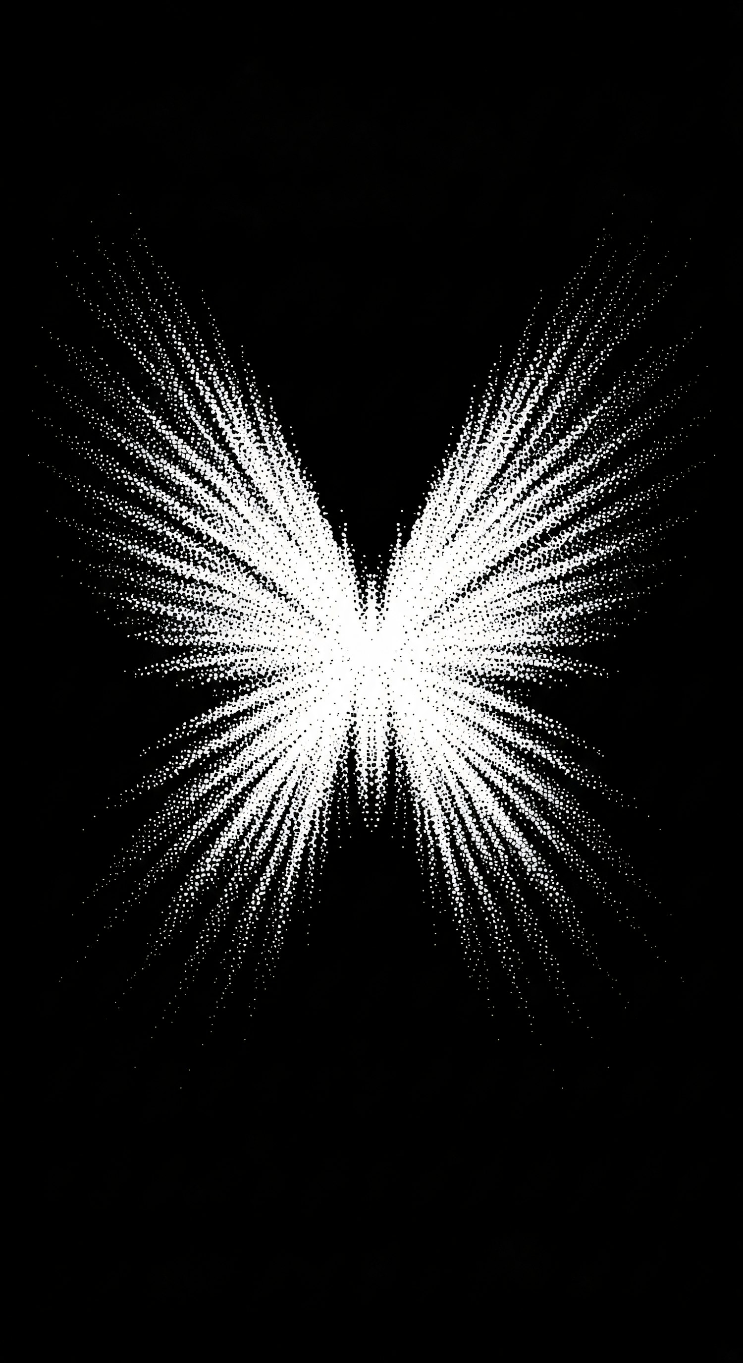 Abstract symmetrical design of white dots forming a butterfly-like shape on a black background.