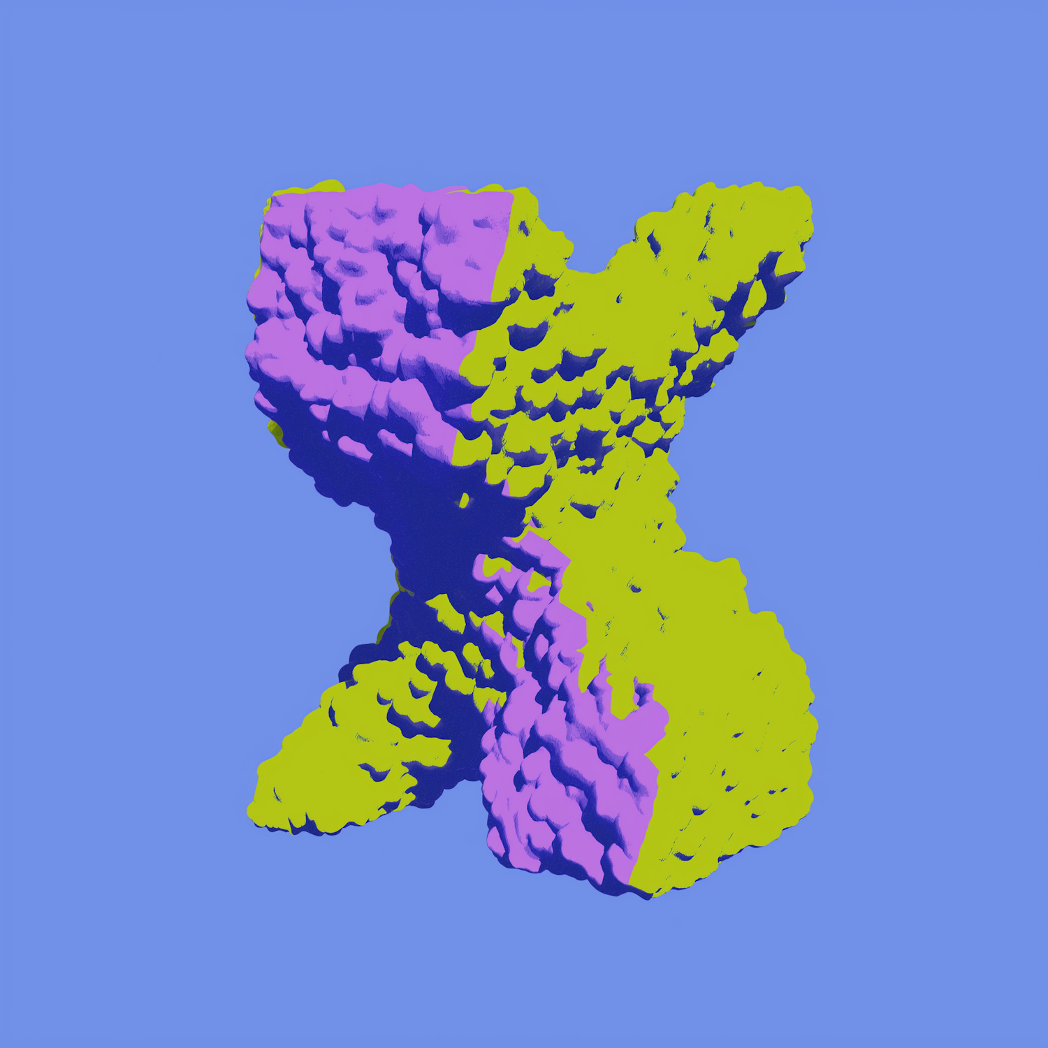 Abstract 3D 'X' shape with purple and yellow textures on a blue background, showcasing a unique organic design.