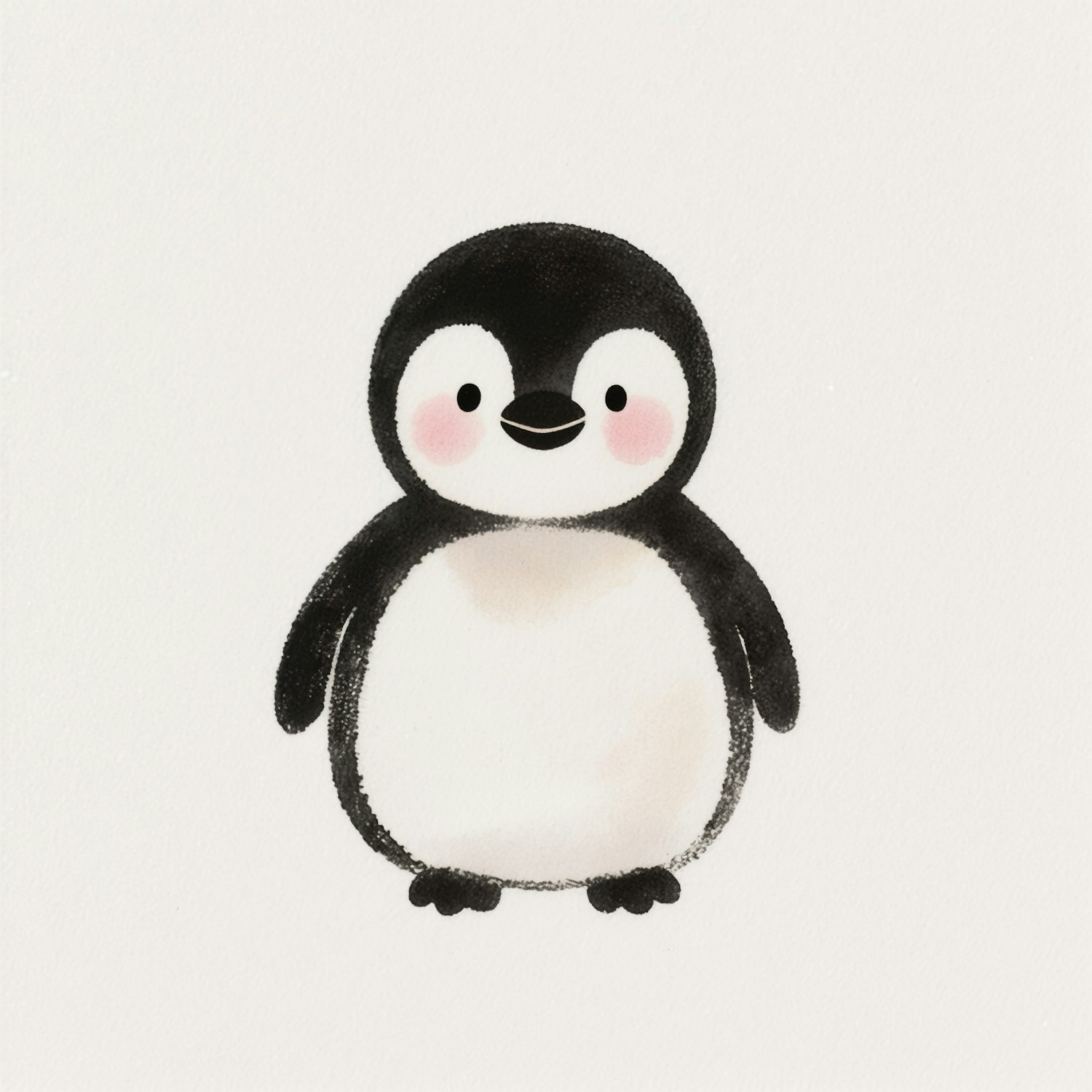 minimalist watercolor-style illustration with soft hand-drawn textures, delicate black outlines, rounded shapes, muted colors, and a clean white background. The style is childlike, friendly, and simple, with subtle blush and no heavy detail. Flat composition, no shading or lighting effects. A cute baby penguin with a round black and white face, tiny beak, small black eyes, and a pink blush on the cheeks, front view only.