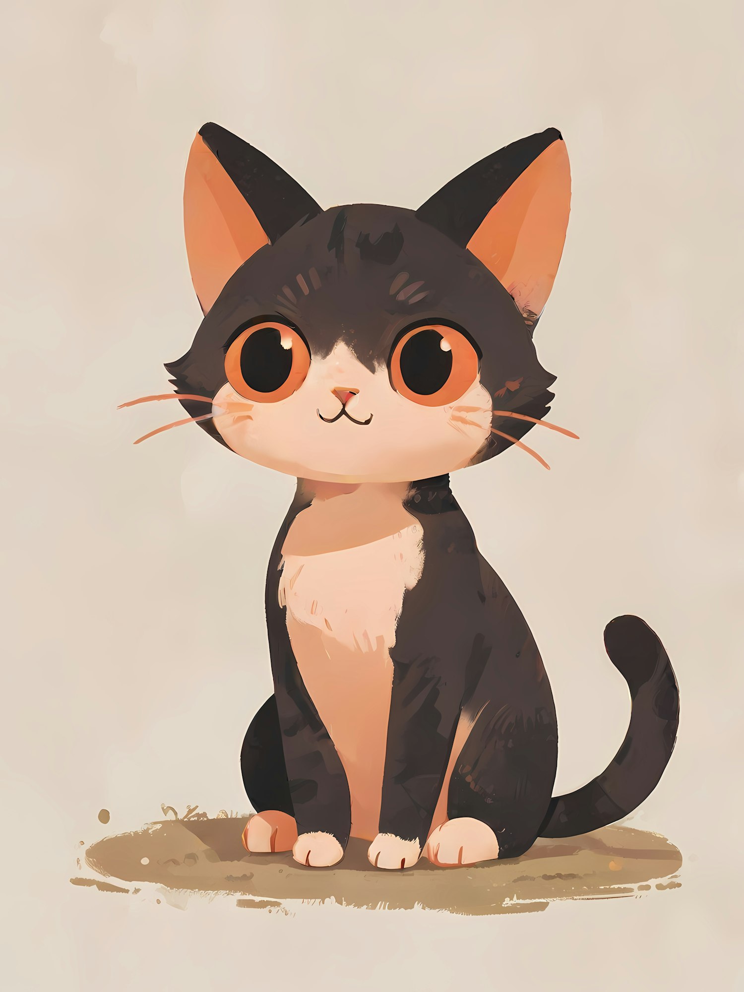 Adorable cartoon cat with big eyes and a friendly smile, featuring black and white fur. Perfect for cat lovers and illustration fans.