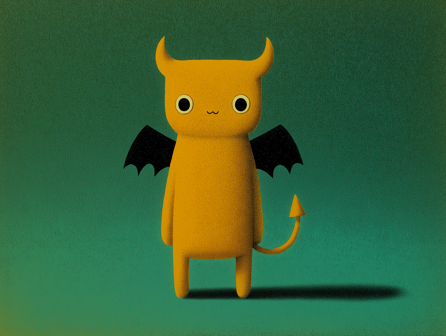 Cute yellow cartoon devil with horns, wings, and a tail on a green background. Adorable and whimsical design with a textured look.