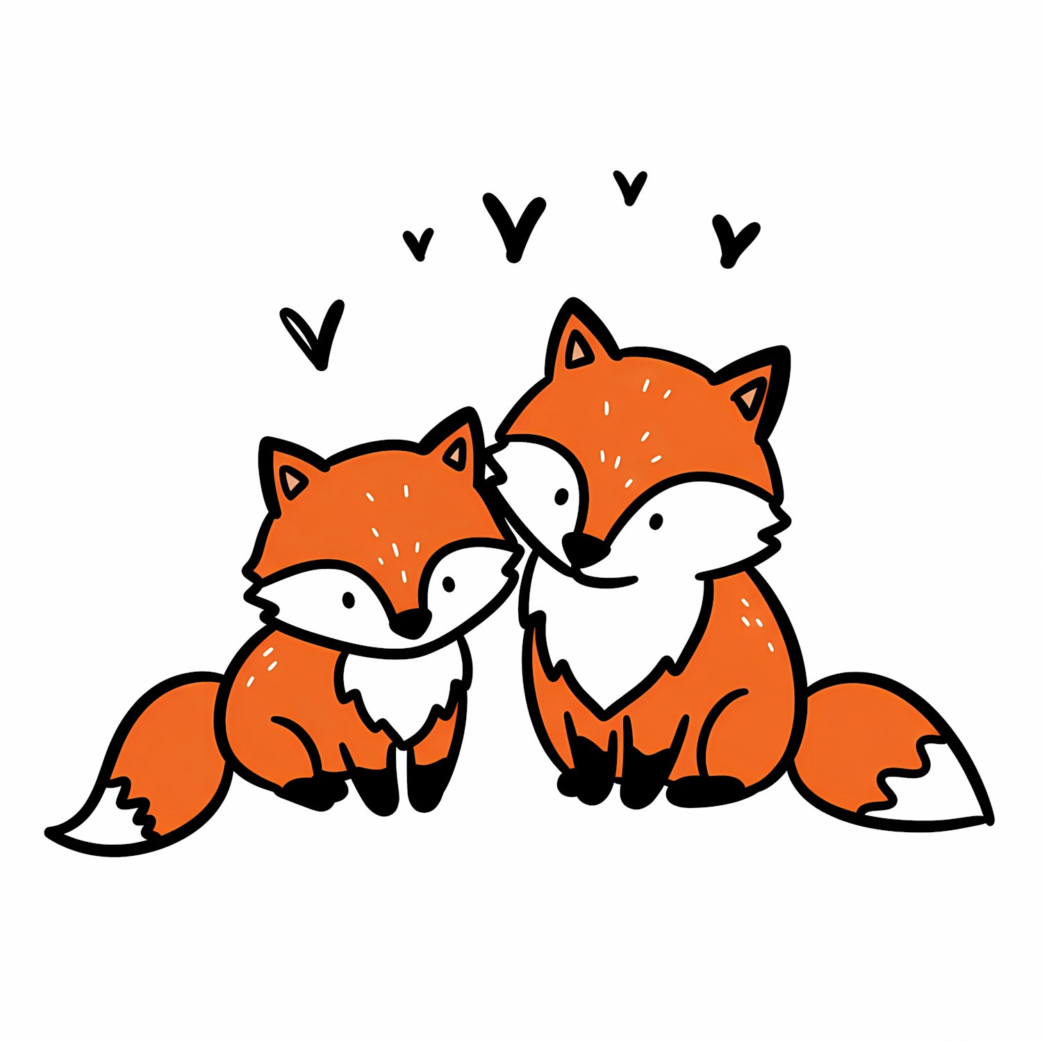 A cute illustration of two cartoon foxes sitting together with hearts above them, drawn in a simple and charming style.