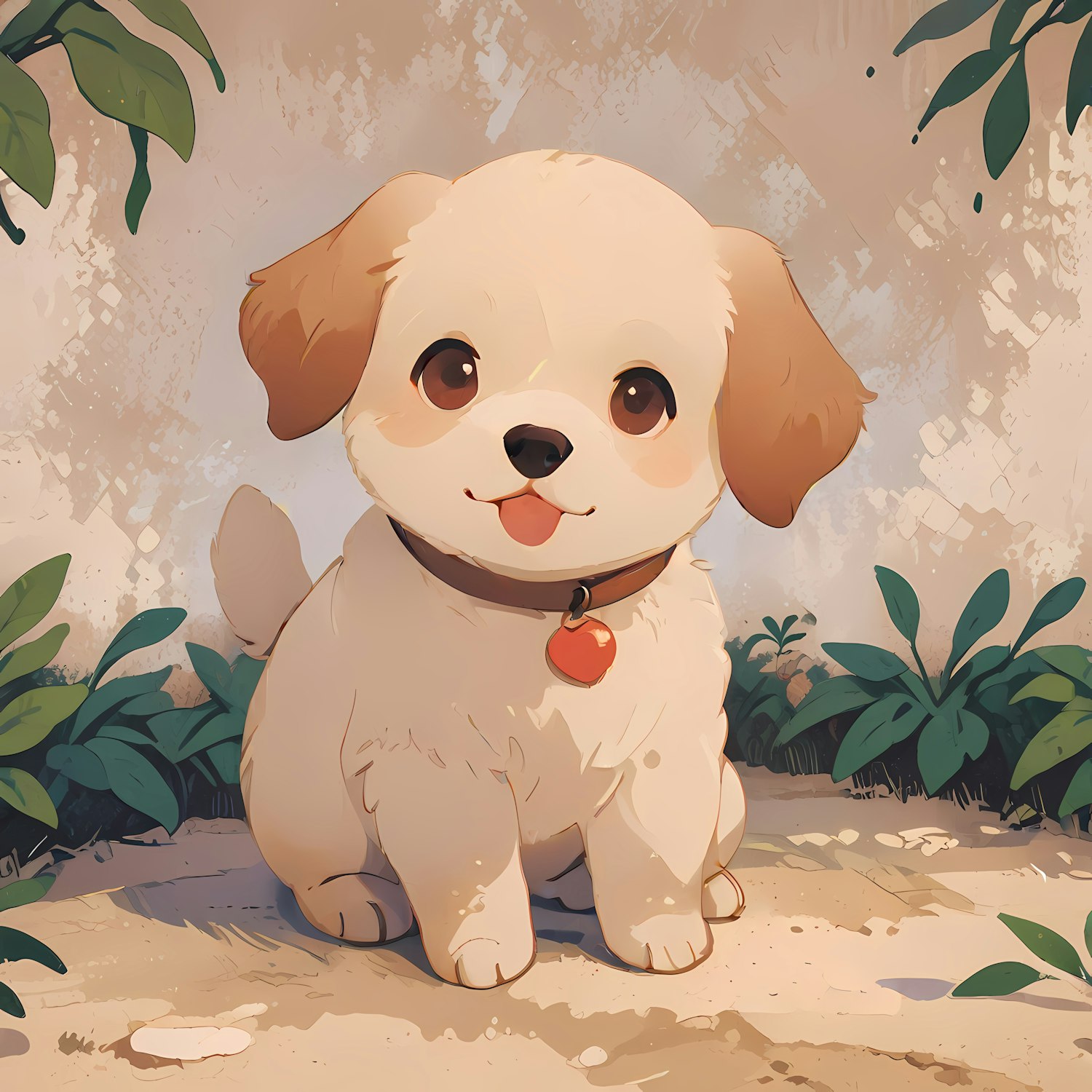 Adorable cartoon puppy with fluffy fur and big eyes, wearing a collar with a red tag, surrounded by green leaves on a beige background.