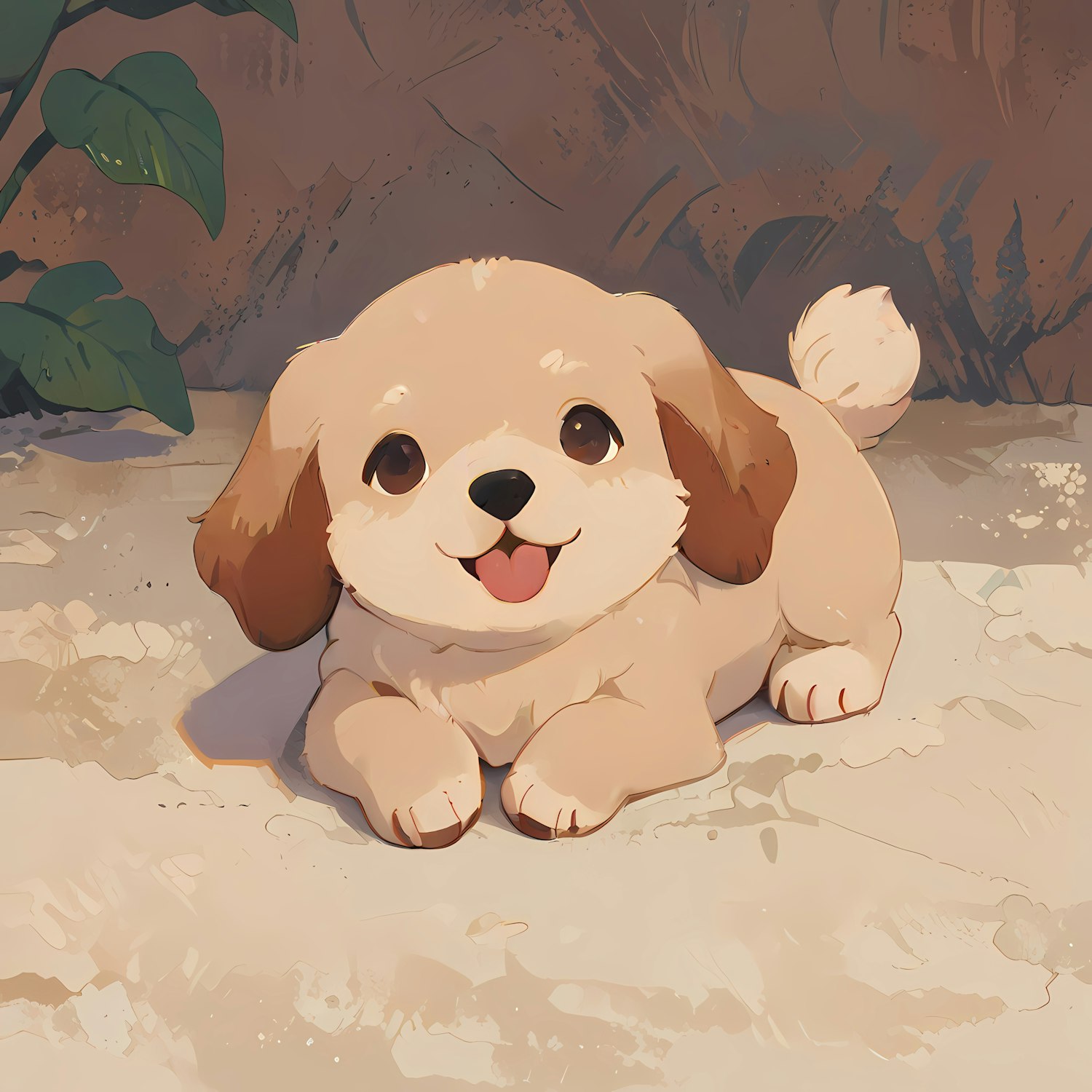 Adorable cartoon puppy with fluffy fur and big eyes, lying on a light surface with green leaves in the background.