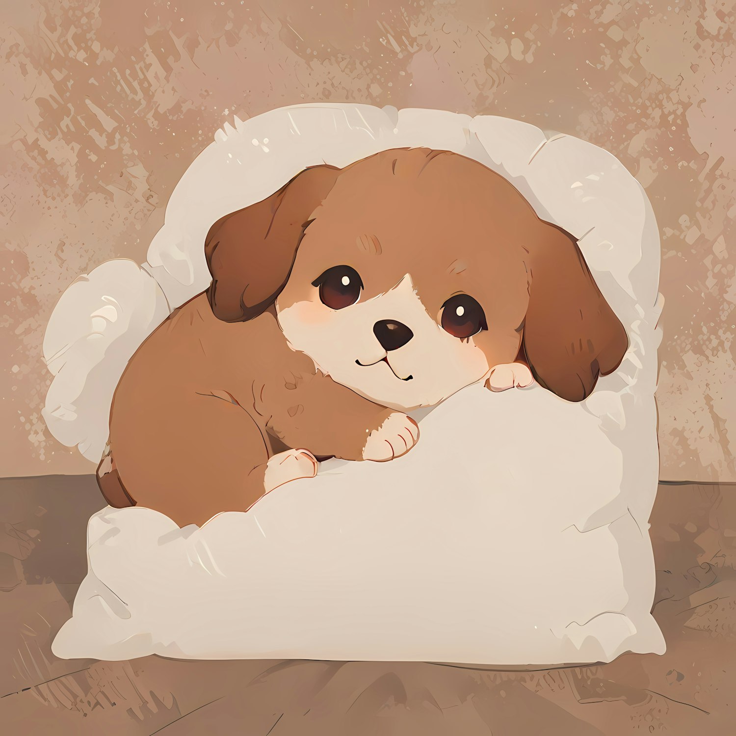 Adorable cartoon puppy snuggled on a fluffy pillow, exuding warmth and cuteness in a cozy, textured setting.