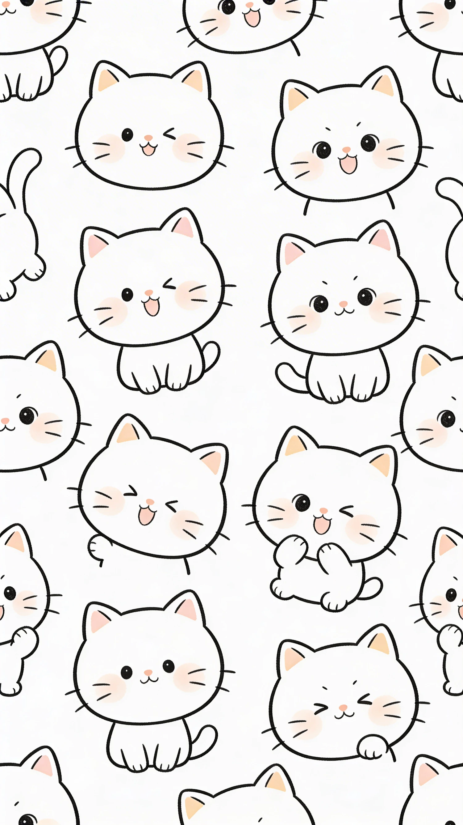 Cute cartoon white cats with pink cheeks in playful poses on a seamless white background, perfect for wallpapers or textiles.