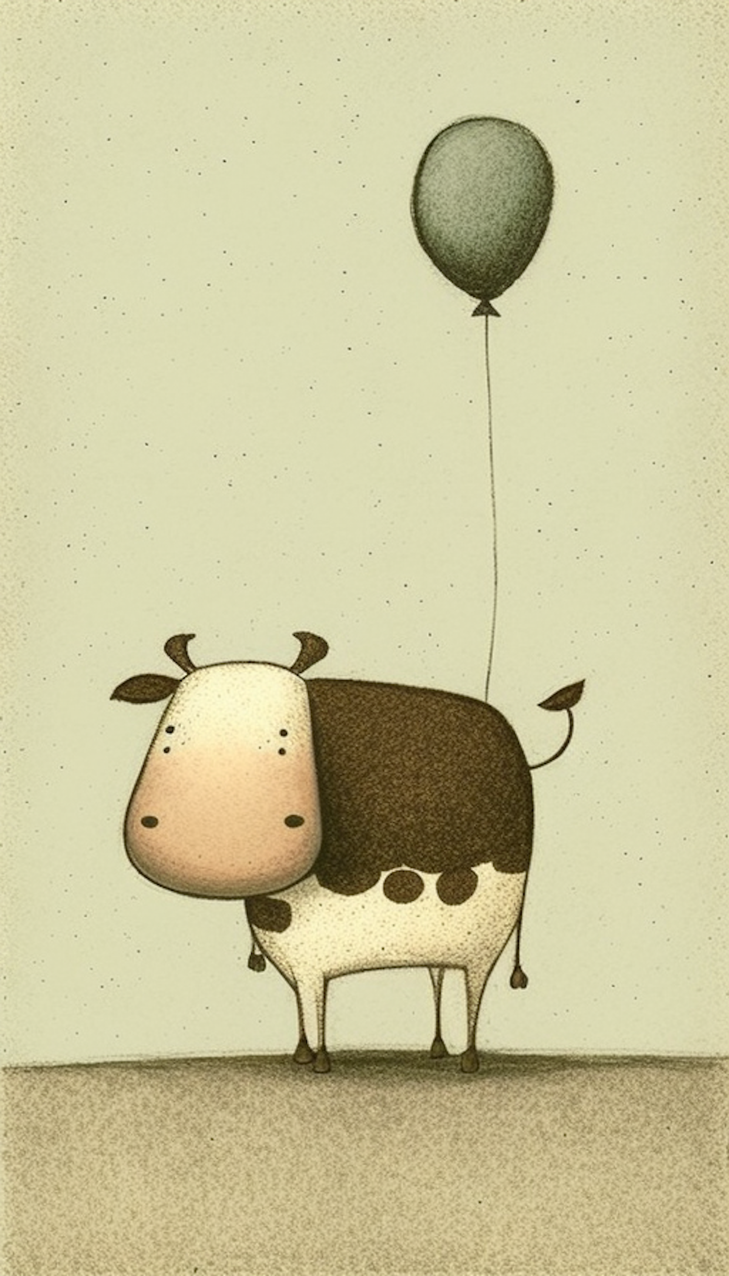 Charming cartoon cow with a balloon tied to its tail, set against a soft green background. Whimsical and playful illustration.
