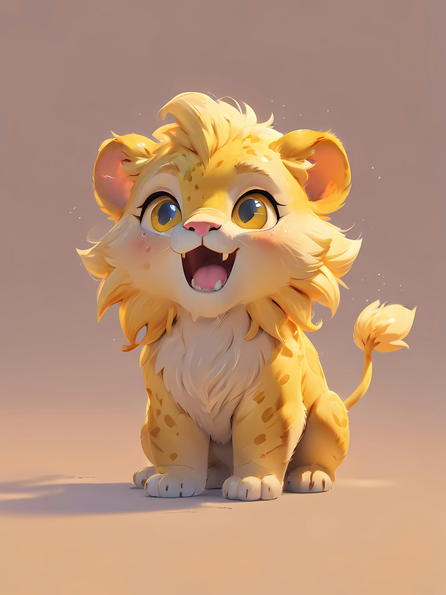 Adorable baby lion cub illustration with golden fur, big blue eyes, and a playful smile, set against a soft beige background.