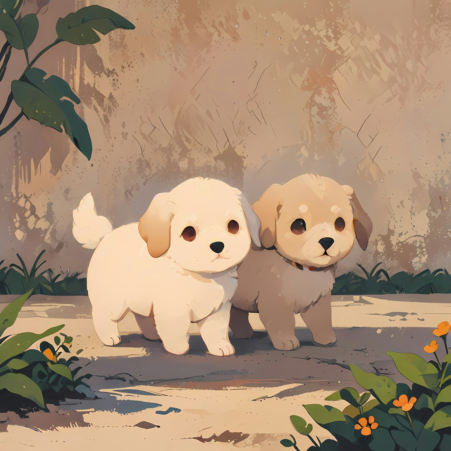 Two fluffy puppies, one white and one light brown, stand on a sunlit path with green plants and orange flowers in the background.