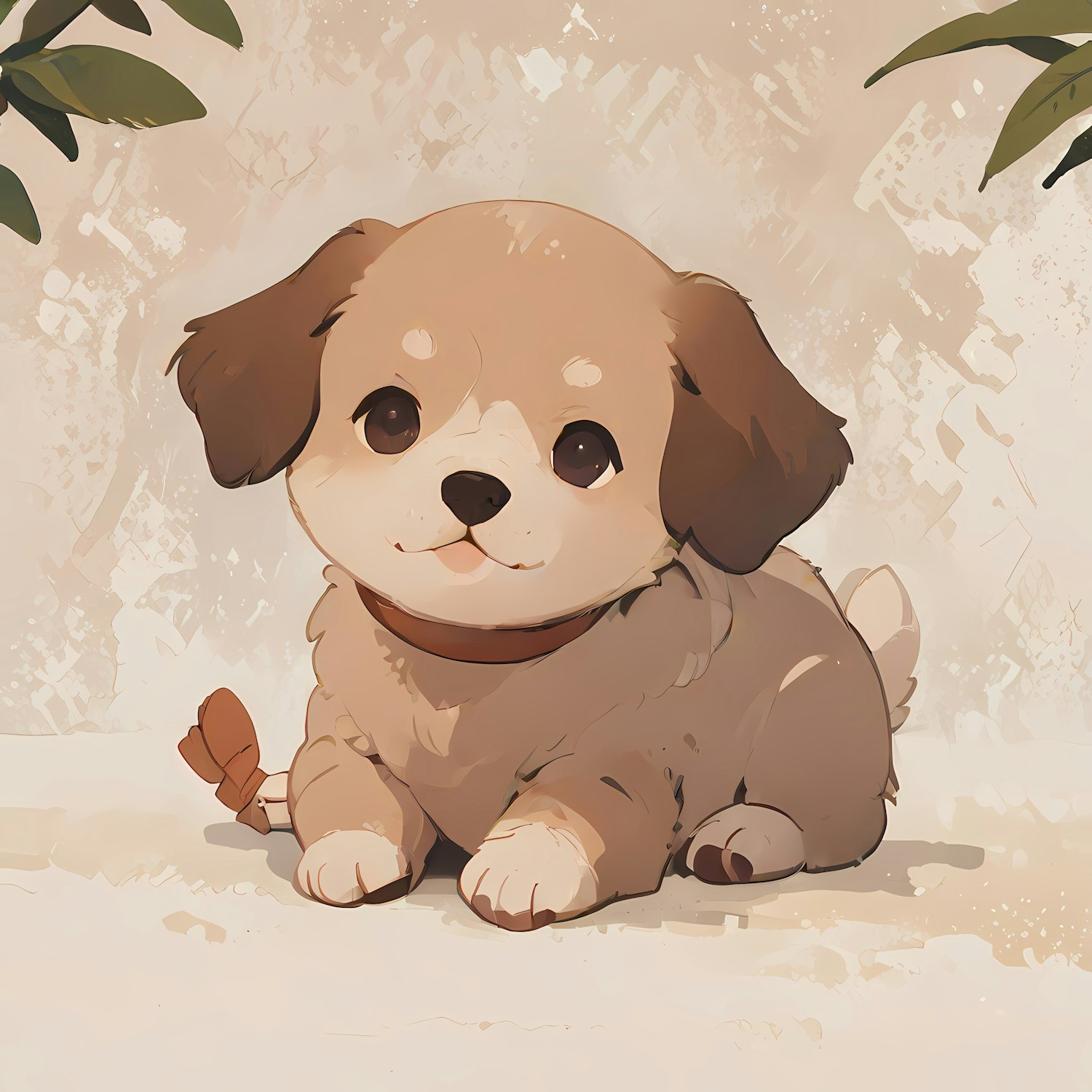 Adorable fluffy puppy illustration with big eyes and a cheerful expression, set against a warm, textured background with green leaves.