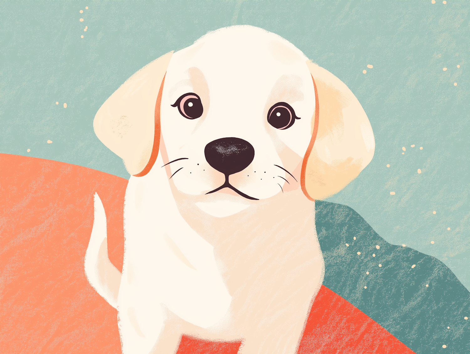 Adorable illustration of a white puppy with floppy ears and big brown eyes, set against a pastel teal and coral background.