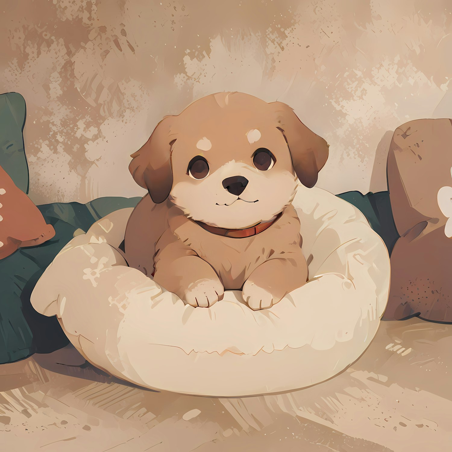 Adorable cartoon puppy in a cozy dog bed surrounded by cushions, with a warm and inviting atmosphere.