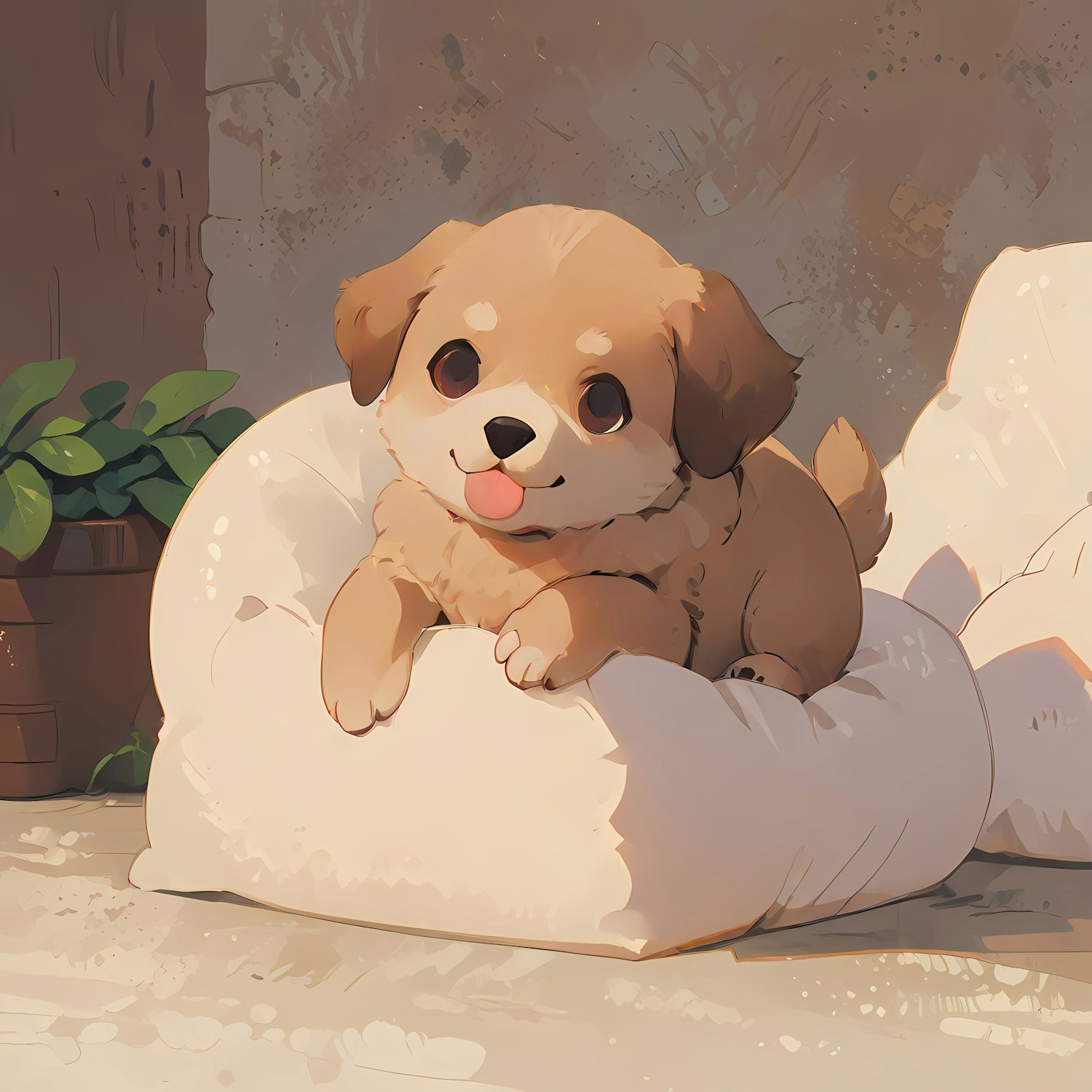Adorable cartoon puppy with fluffy fur and big eyes, lounging on a soft cushion. Warm tones and a potted plant add charm.
