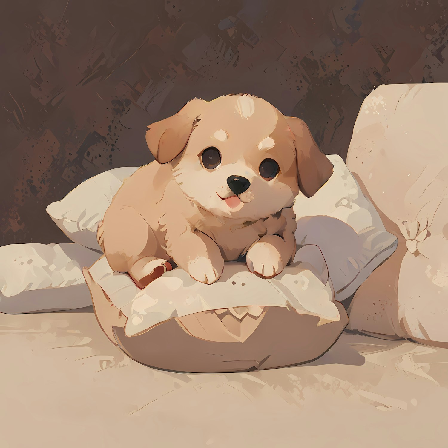 Adorable cartoon puppy with big eyes on soft pillows, set against a cozy, textured background. Perfect for pet lovers!