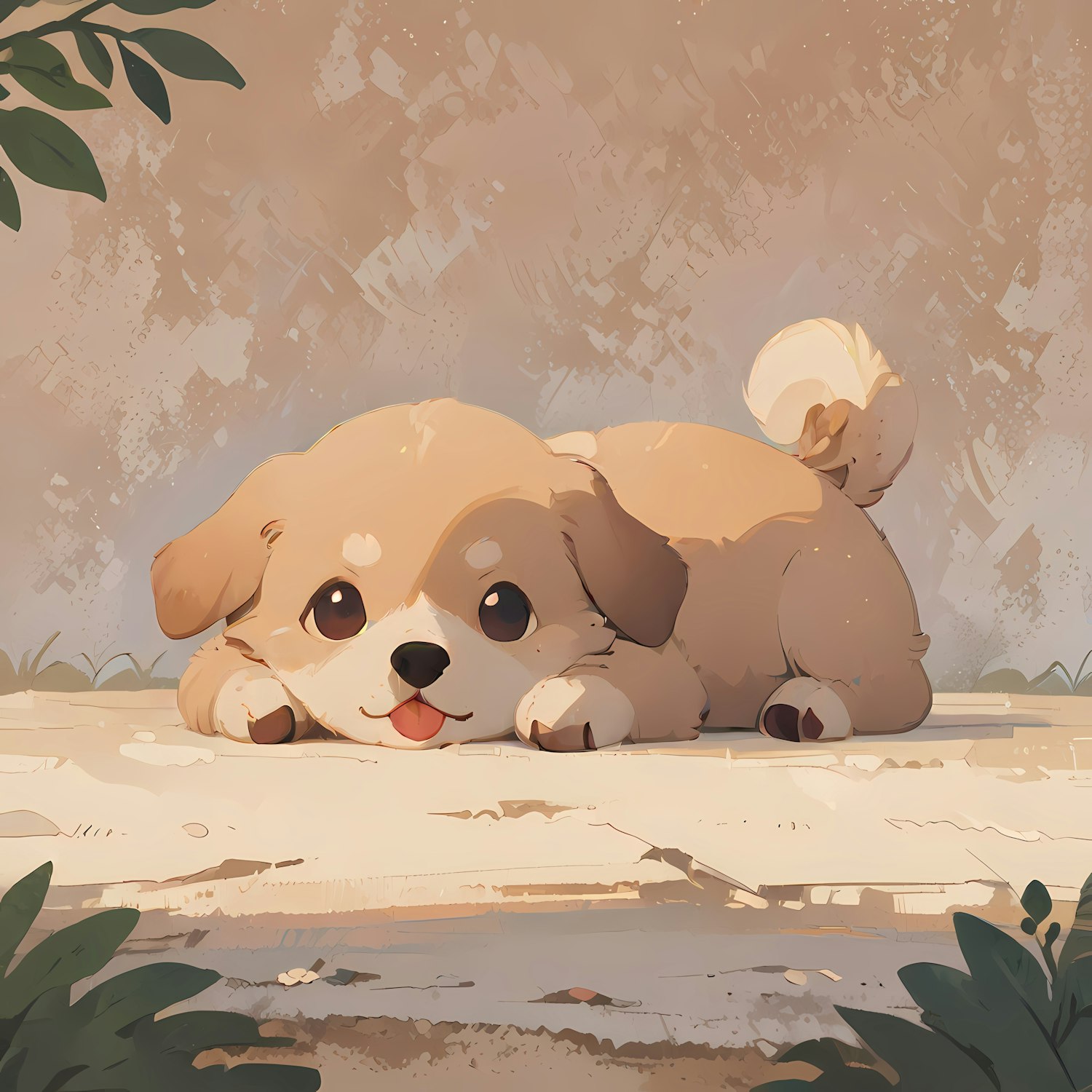 Adorable cartoon puppy with big eyes and a fluffy tail, lying on a textured surface with a warm, abstract background.