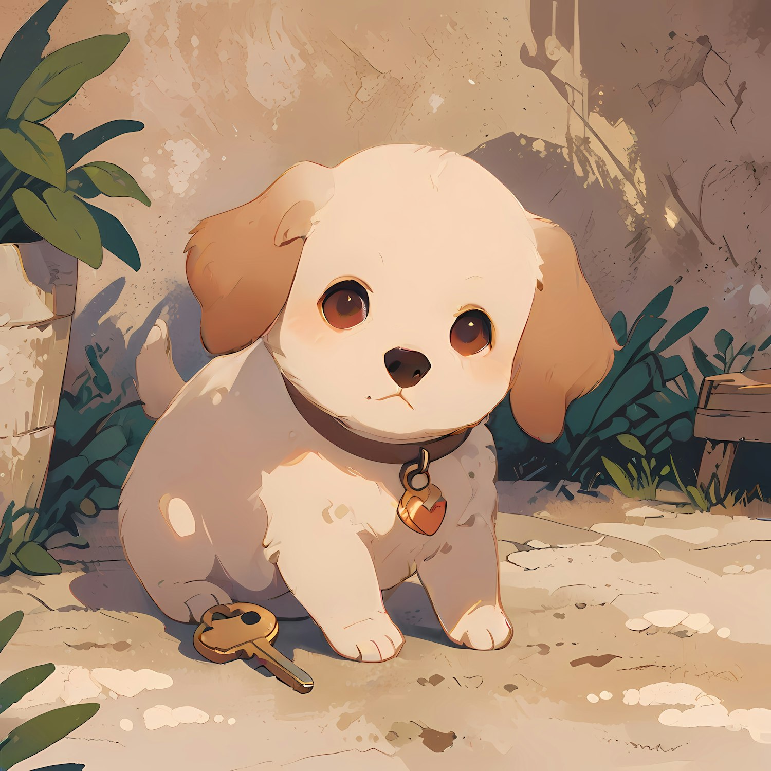 Adorable puppy with a heart tag and a golden key on a sunlit path, surrounded by greenery and rustic charm.