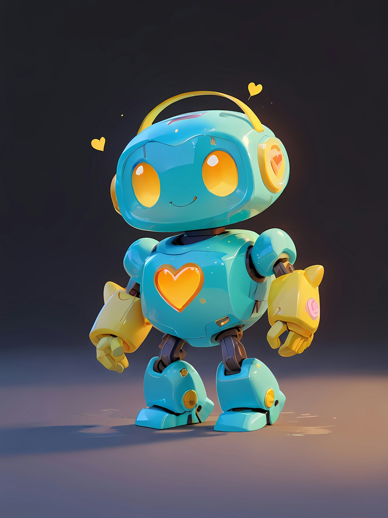 Adorable teal robot with glowing orange eyes, heart chest light, and yellow headphones, surrounded by floating hearts on a dark background.
