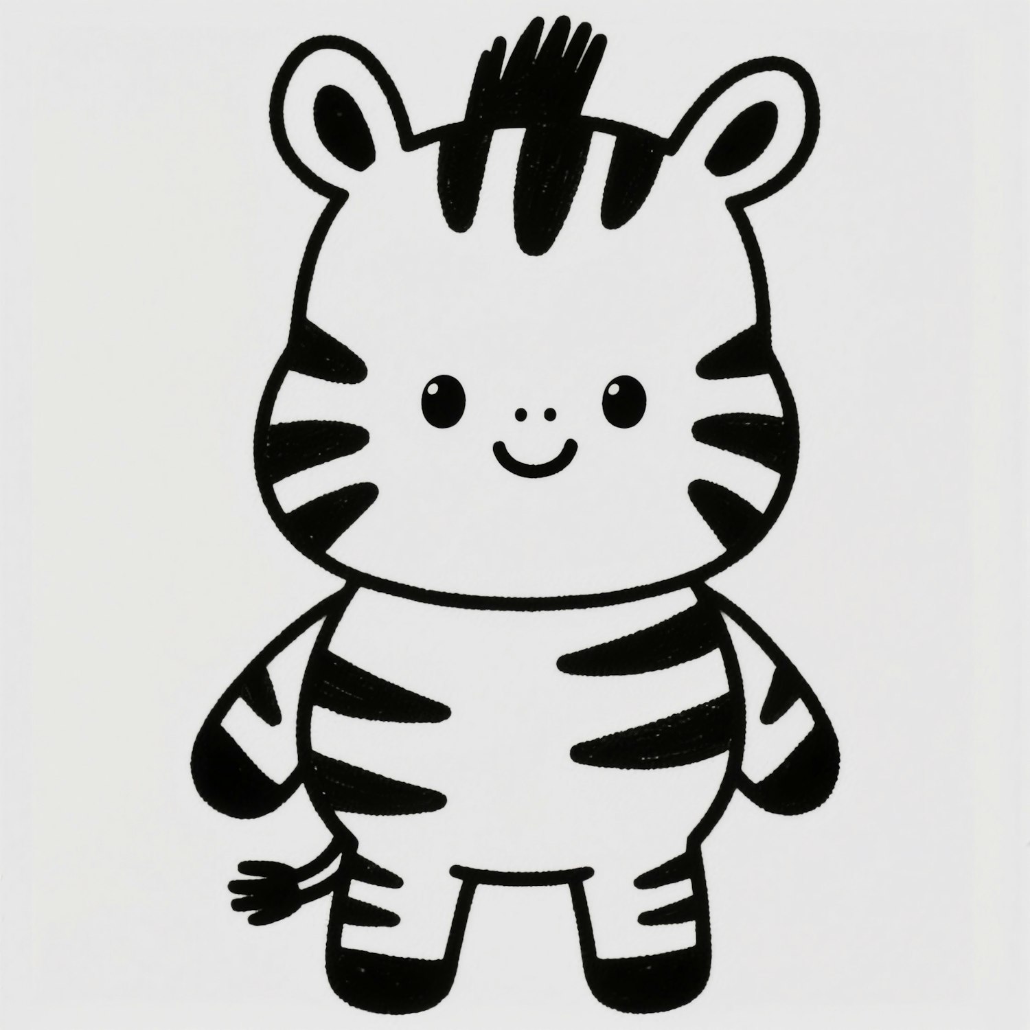 black line drawing of a cute baby zebra, minimal and whimsical style, front view only, simple facial expression, white background, no shading or colors, childlike design