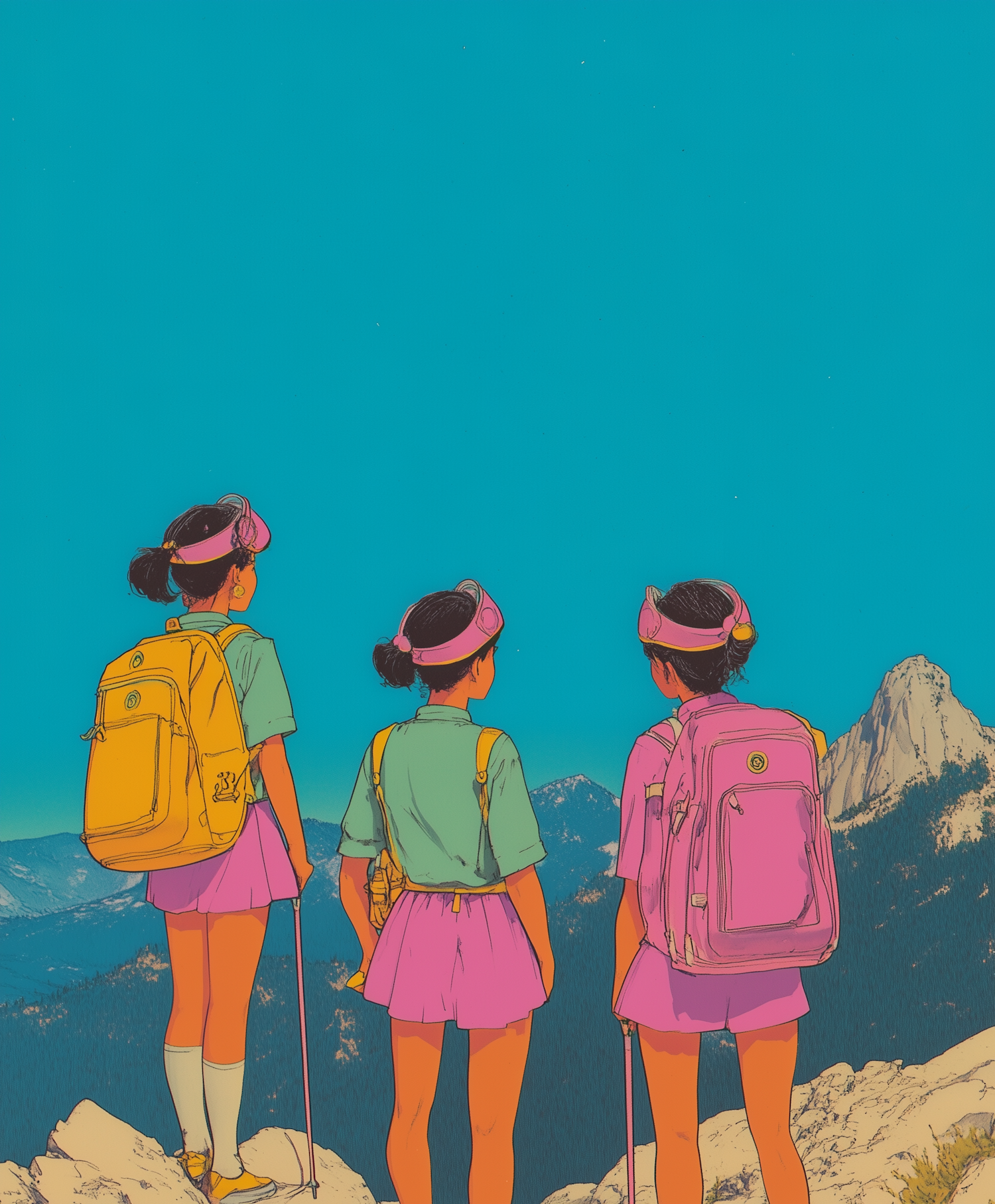 Three girls in colorful outfits stand on a mountain peak, gazing at the view. Vibrant colors and a clear blue sky create a sense of adventure.