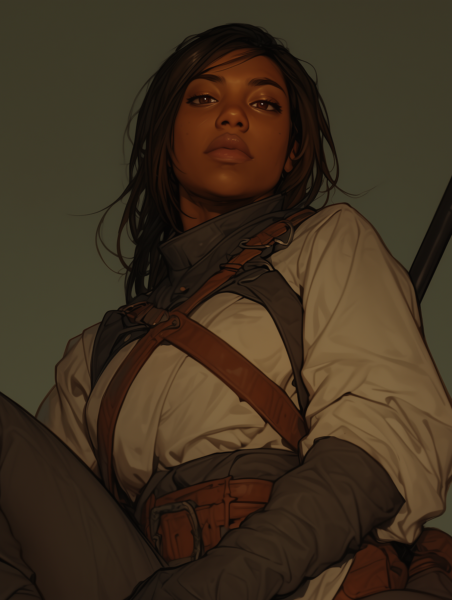 Confident woman with brown skin and dark hair in a white shirt and harness, set against a muted green background.