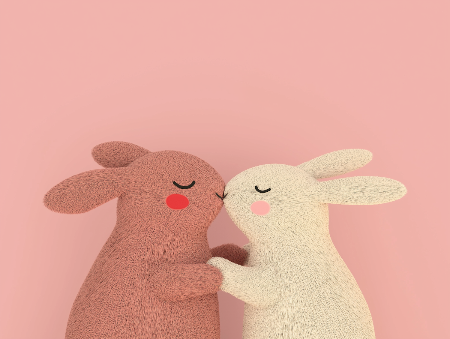 Two cartoon rabbits in a loving embrace on a pink background, showcasing affection and warmth with textured fur and gentle expressions.