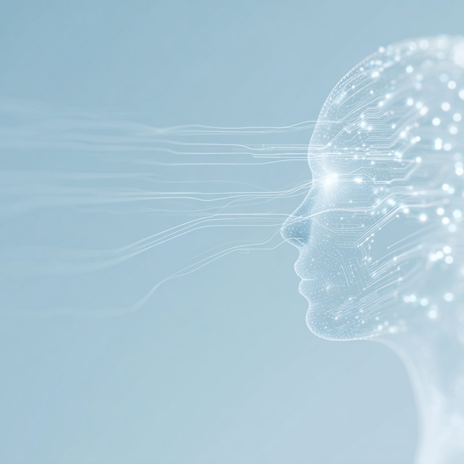 Futuristic digital artwork of a human-like face with circuits and glowing lines, symbolizing AI and technology in a sleek, modern design.