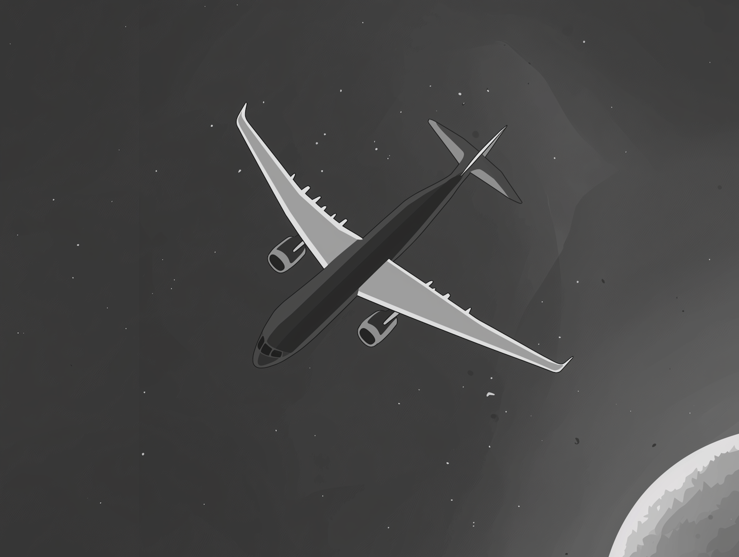 Illustration of a sleek airplane flying over a starry night sky with a celestial body in view, evoking a sense of exploration.