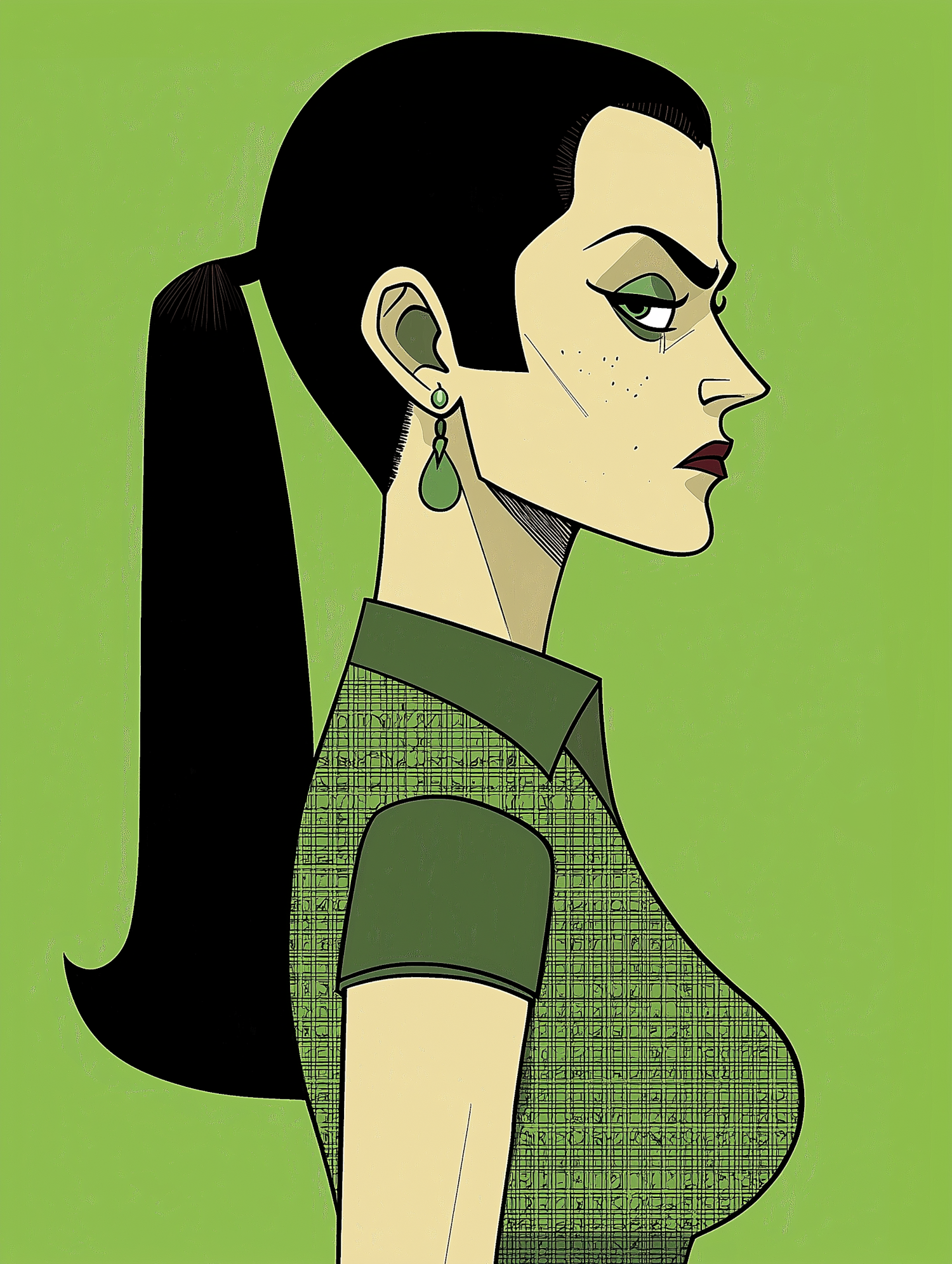 Stylized profile illustration of a woman with a sleek ponytail, green outfit, and bold expression against a vibrant green background.