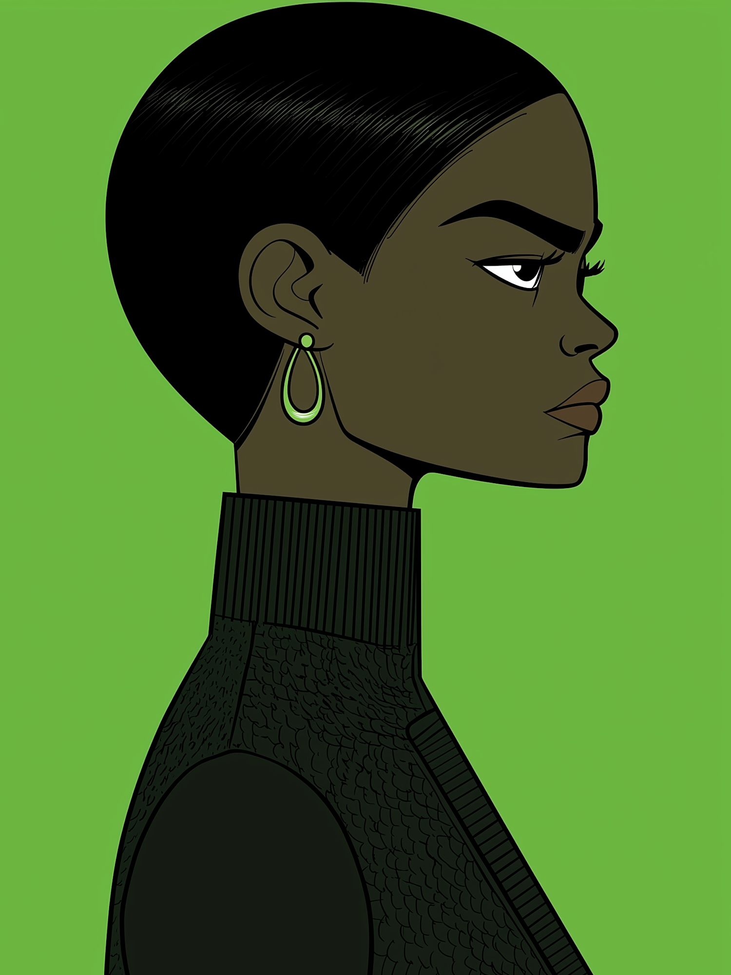 Stylized profile illustration of a woman with short hair, green earrings, and a textured jacket against a vibrant green background.