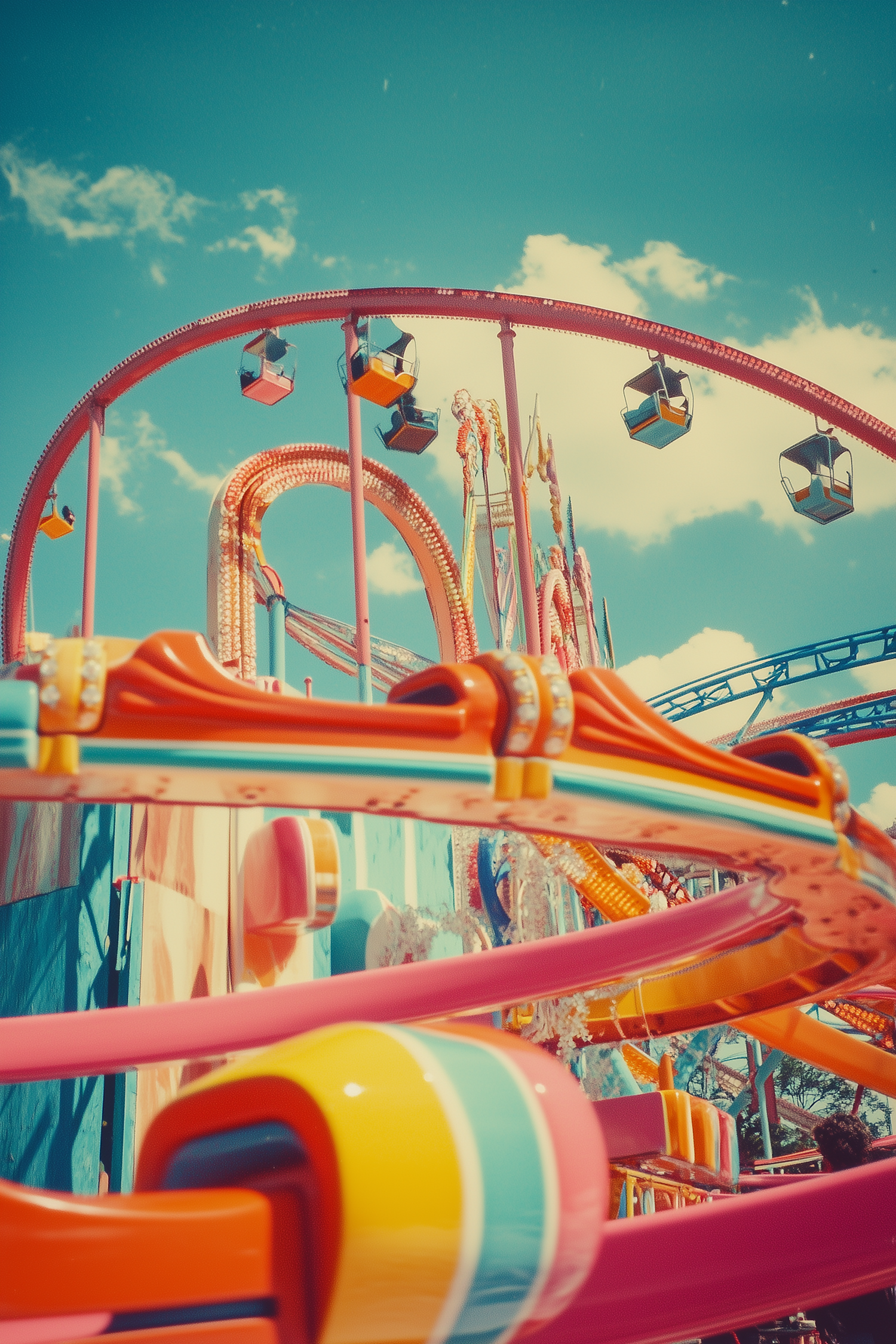 Colorful amusement park with vibrant roller coaster and sky ride under a clear blue sky, capturing excitement and energy.
