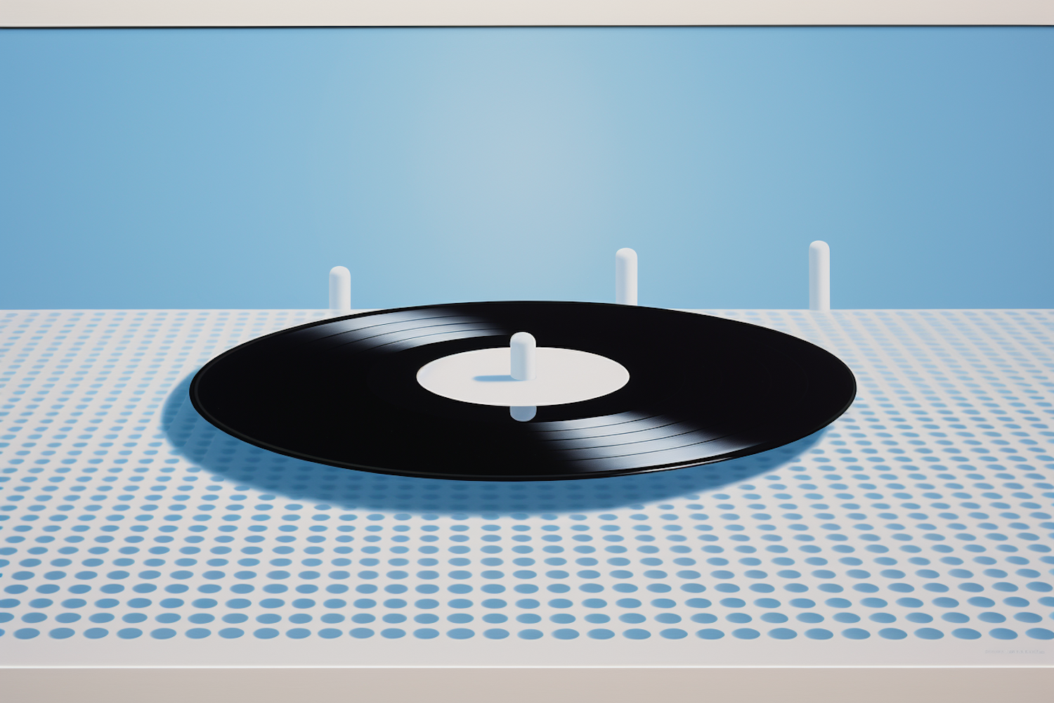 Minimalist illustration of a floating vinyl record on a dotted surface with a blue background, featuring geometric elements.