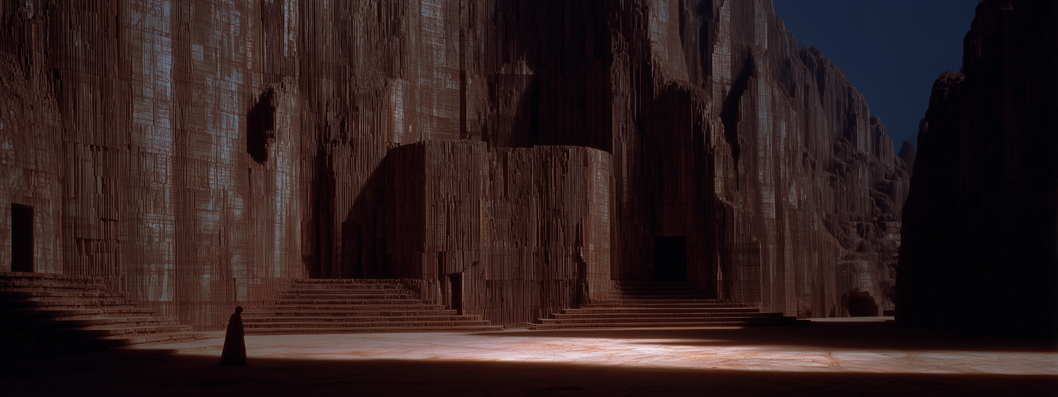 A lone figure stands before a massive, intricately carved cliff structure under soft lighting, evoking mystery and grandeur.
