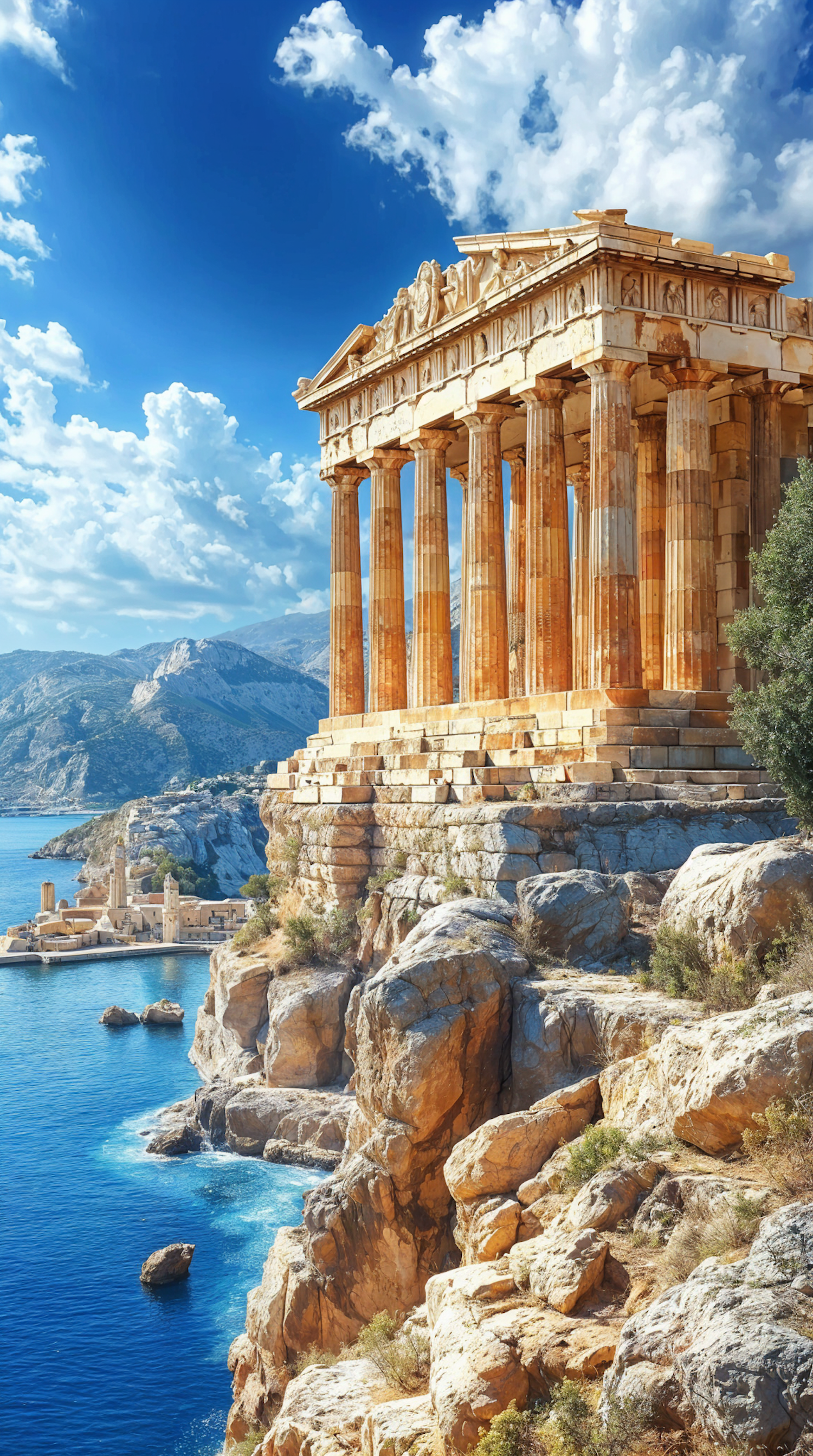 Ancient Greek temple on a rocky cliff by the sea, with golden columns, blue waters, and a vibrant sky filled with fluffy clouds.