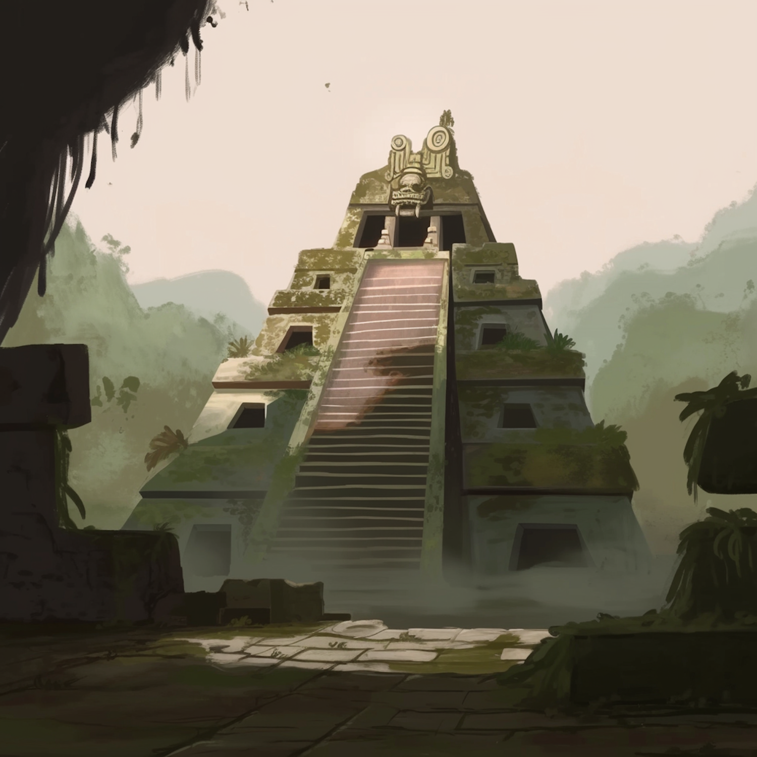 Ancient pyramid in a lush jungle with moss-covered stones and intricate carvings, evoking mystery and adventure.