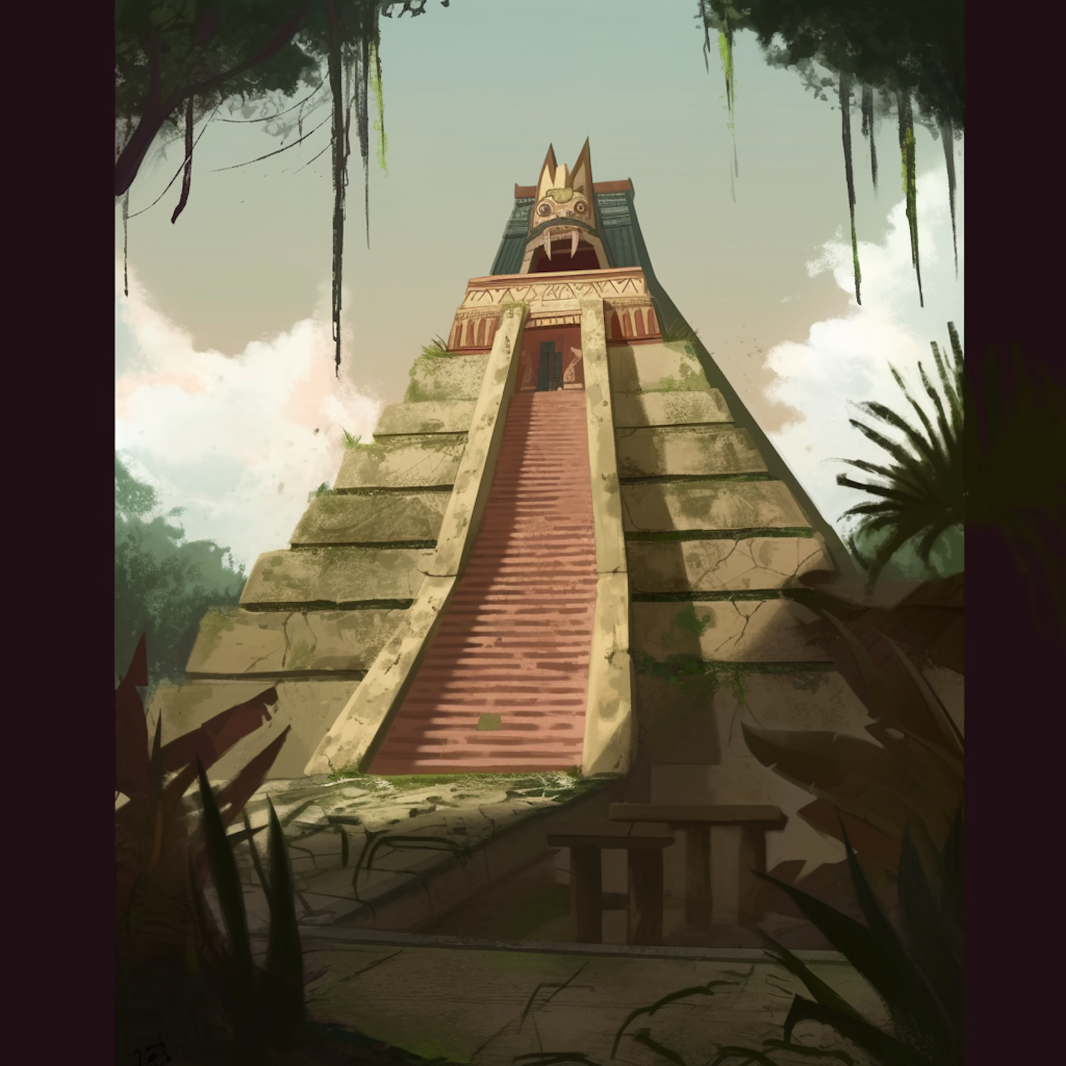 Majestic ancient pyramid in a jungle, featuring steep stairs, a decorative facade, and lush vegetation under a partly cloudy sky.