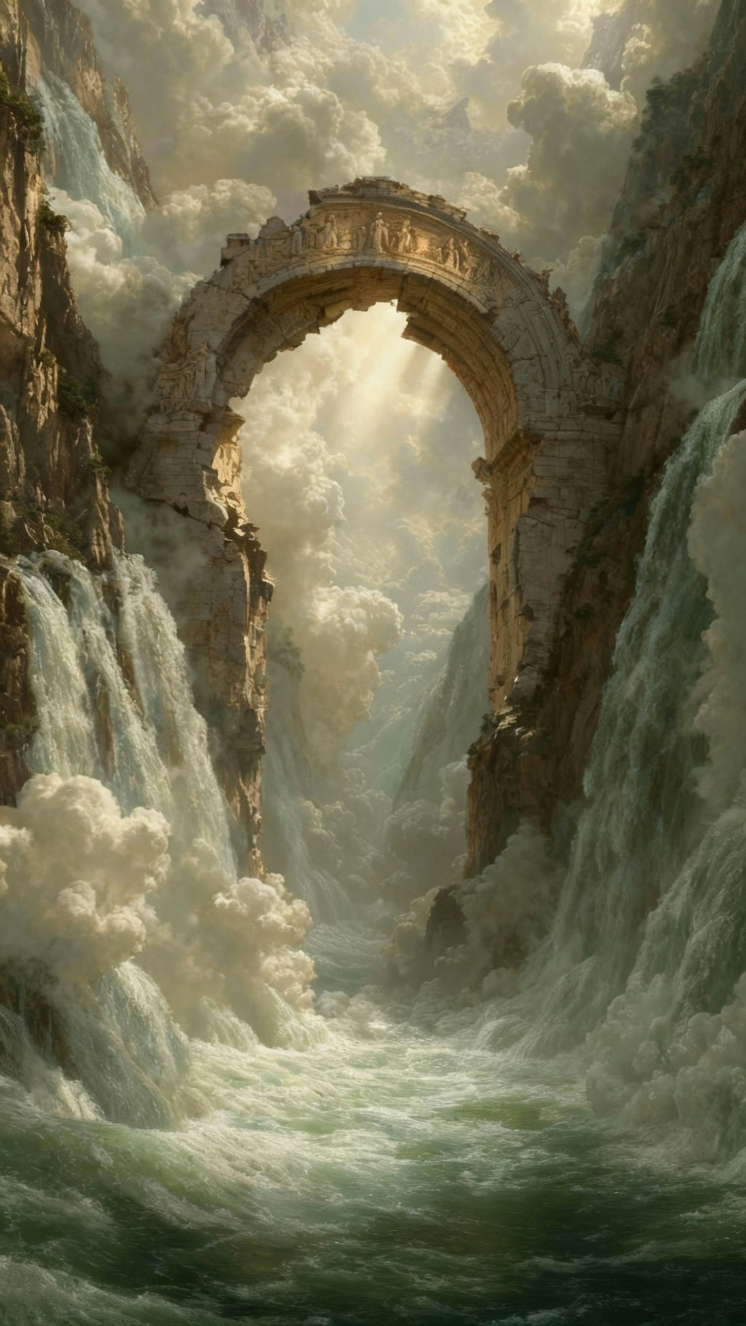 A majestic ancient stone archway amidst cliffs and waterfalls, with sunlight streaming through clouds, creating a mystical atmosphere.