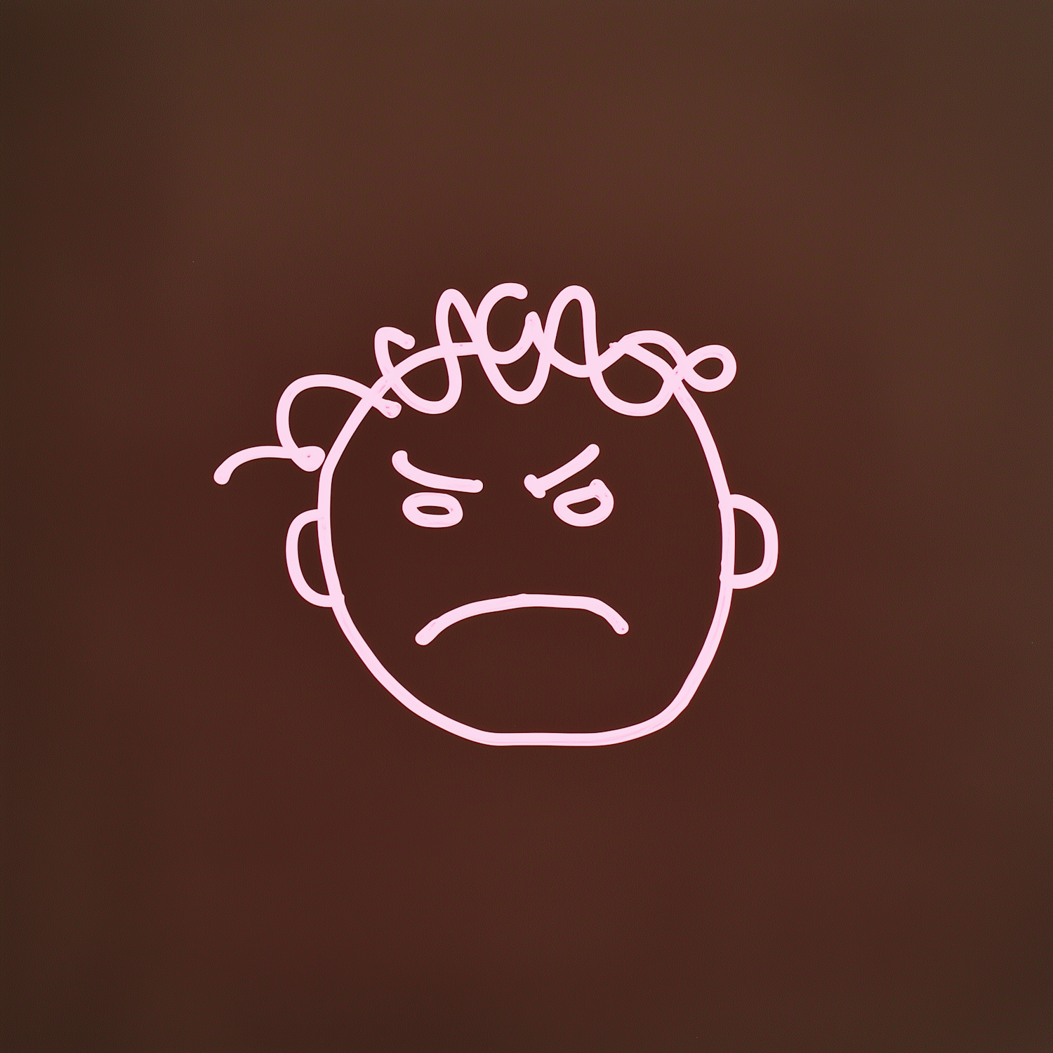 Simple line drawing of an angry face with curly hair on a dark brown background, outlined in bright pink.