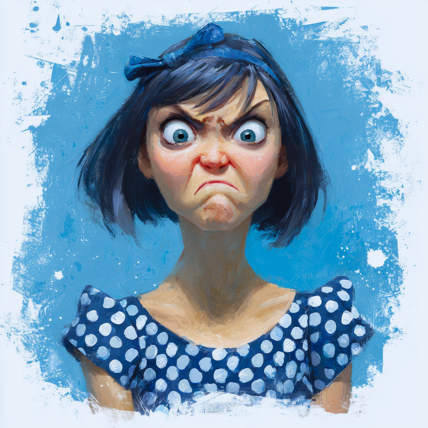 A humorous illustration of a young woman with an exaggerated angry expression, wearing a blue polka-dot dress and matching bow.