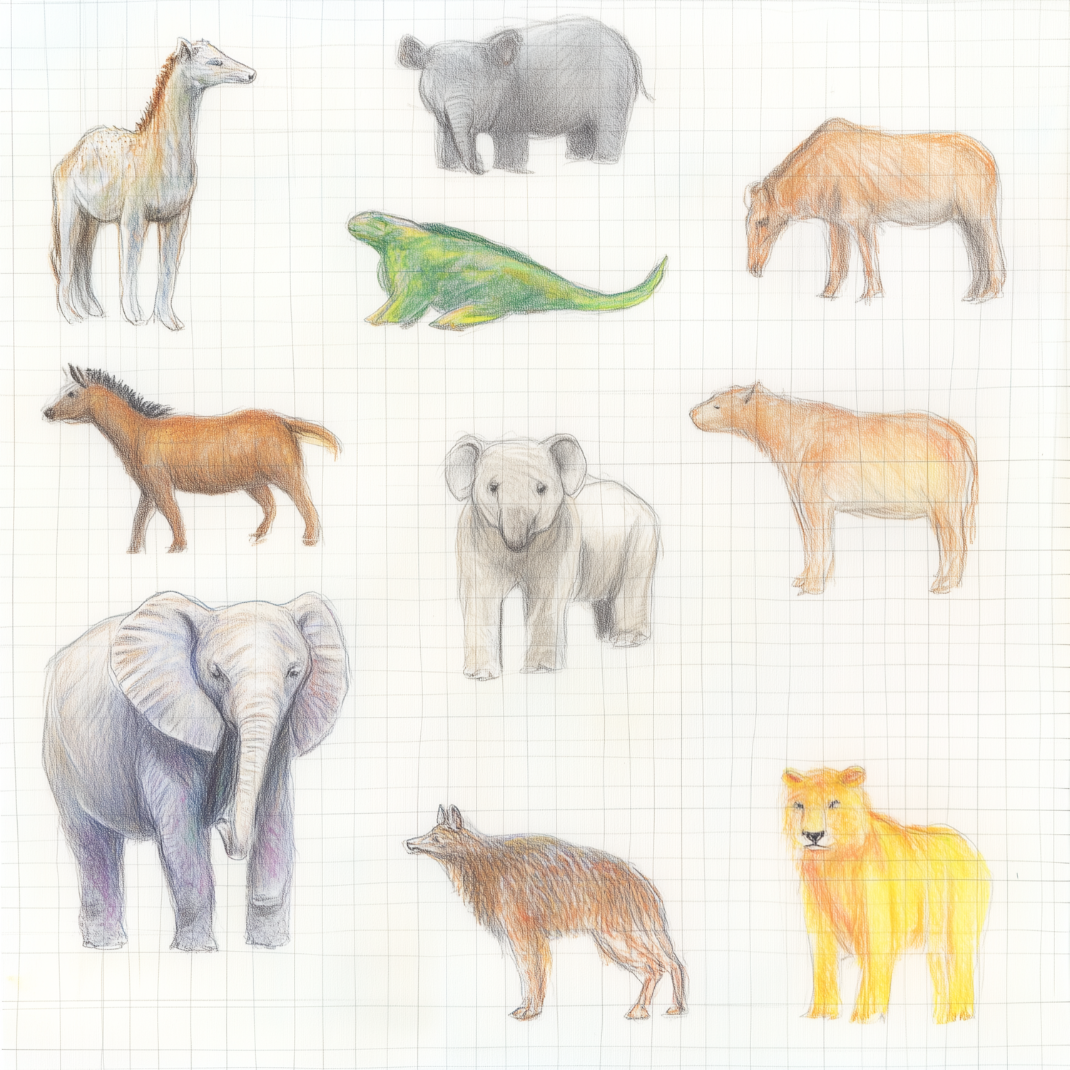 Hand-drawn animal illustrations on grid paper, featuring a giraffe, elephant, iguana, horse, capybara, and lion in vibrant colors.