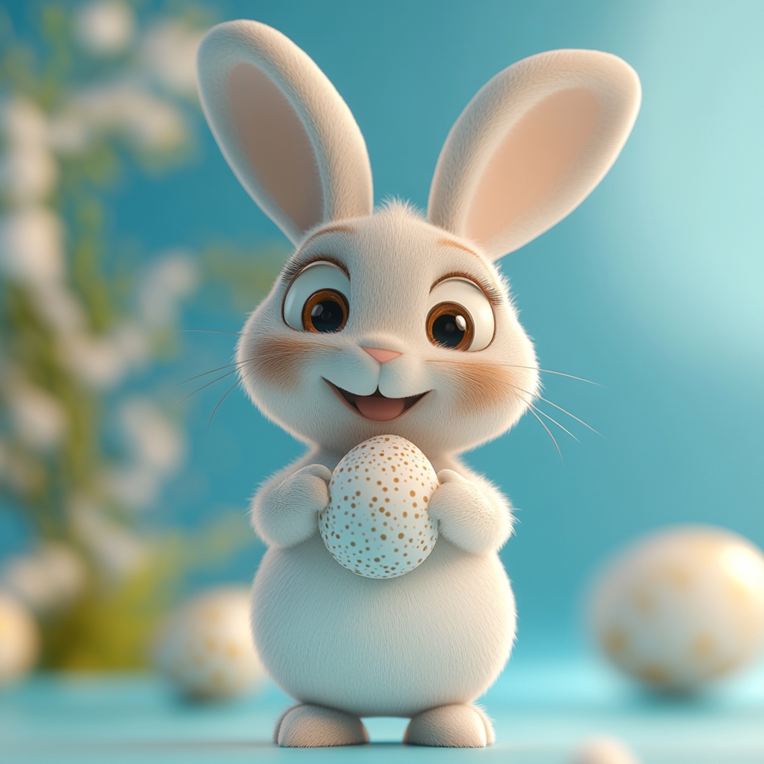 Adorable animated bunny holding a speckled egg with a cheerful smile, set against a bright blue background with springtime vibes.