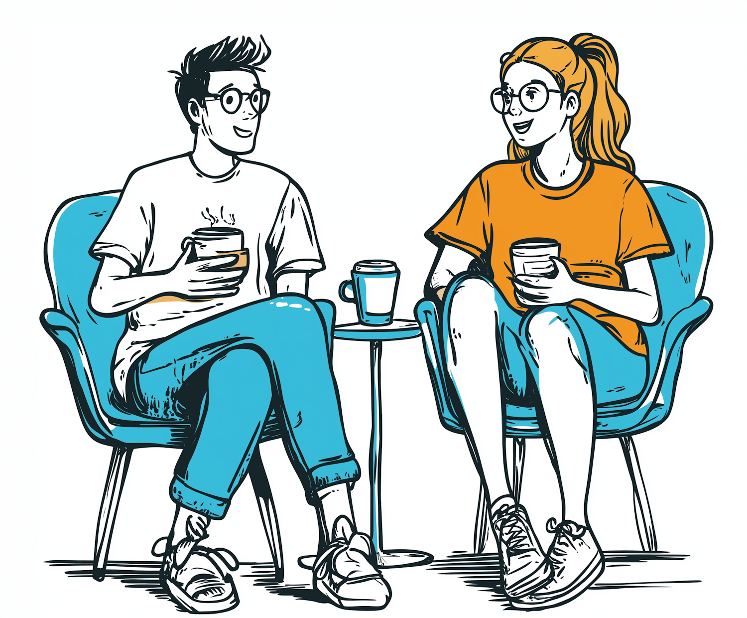 Cartoon illustration of two friends chatting over coffee, sitting in blue chairs with a small table between them.