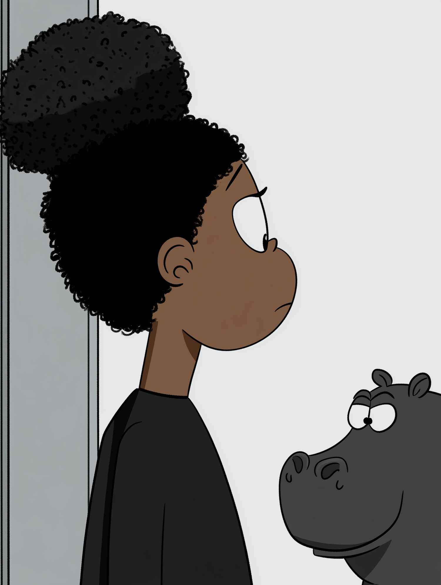 Cartoon illustration of a young Black girl with curly hair and a hippo companion, both in profile against a light gray background.