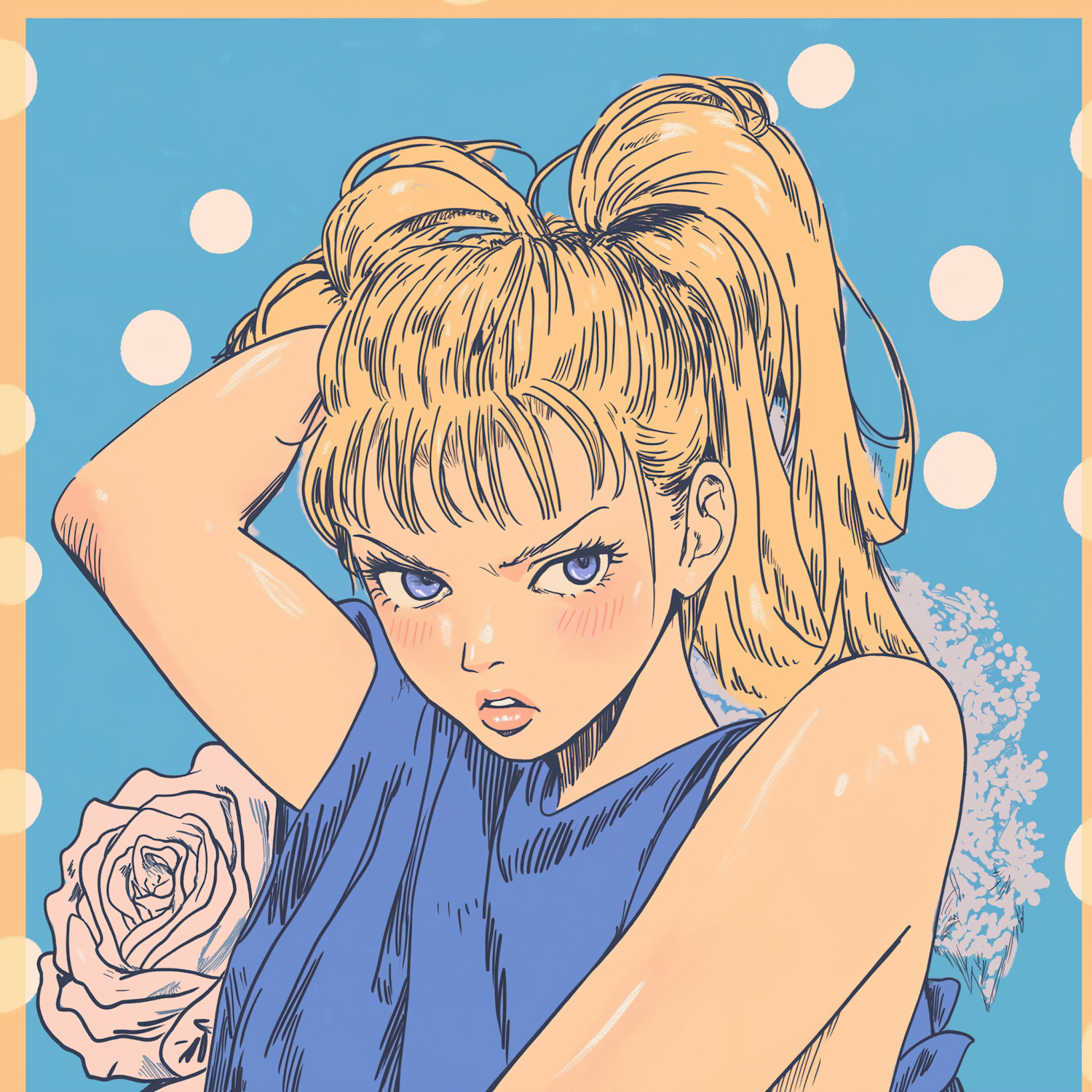 Anime-style illustration of a blonde woman with blue eyes and a ponytail, set against a polka dot background with a pink rose.