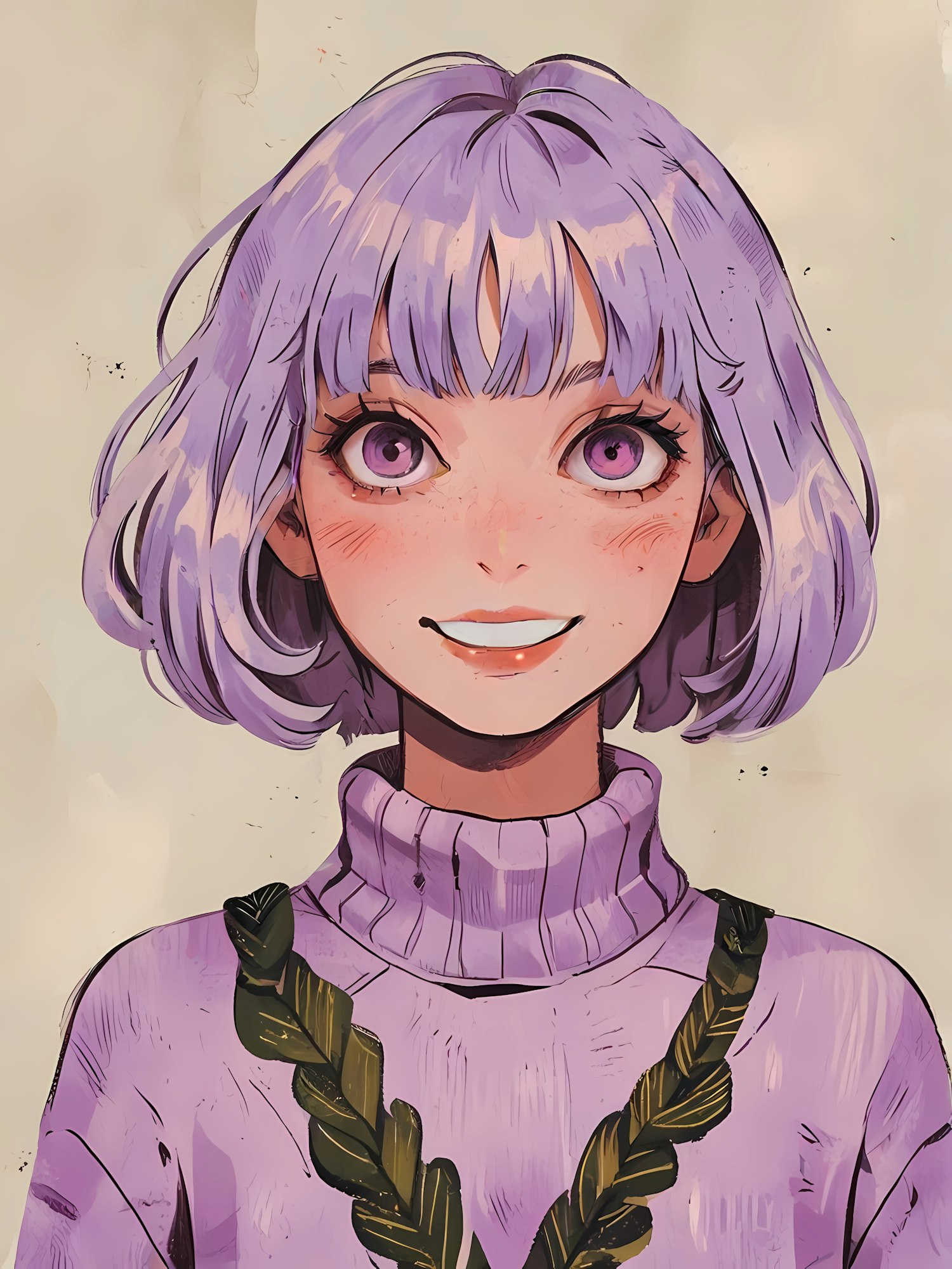 Illustration of a cheerful young woman with purple hair and eyes, wearing a purple sweater with green accents.