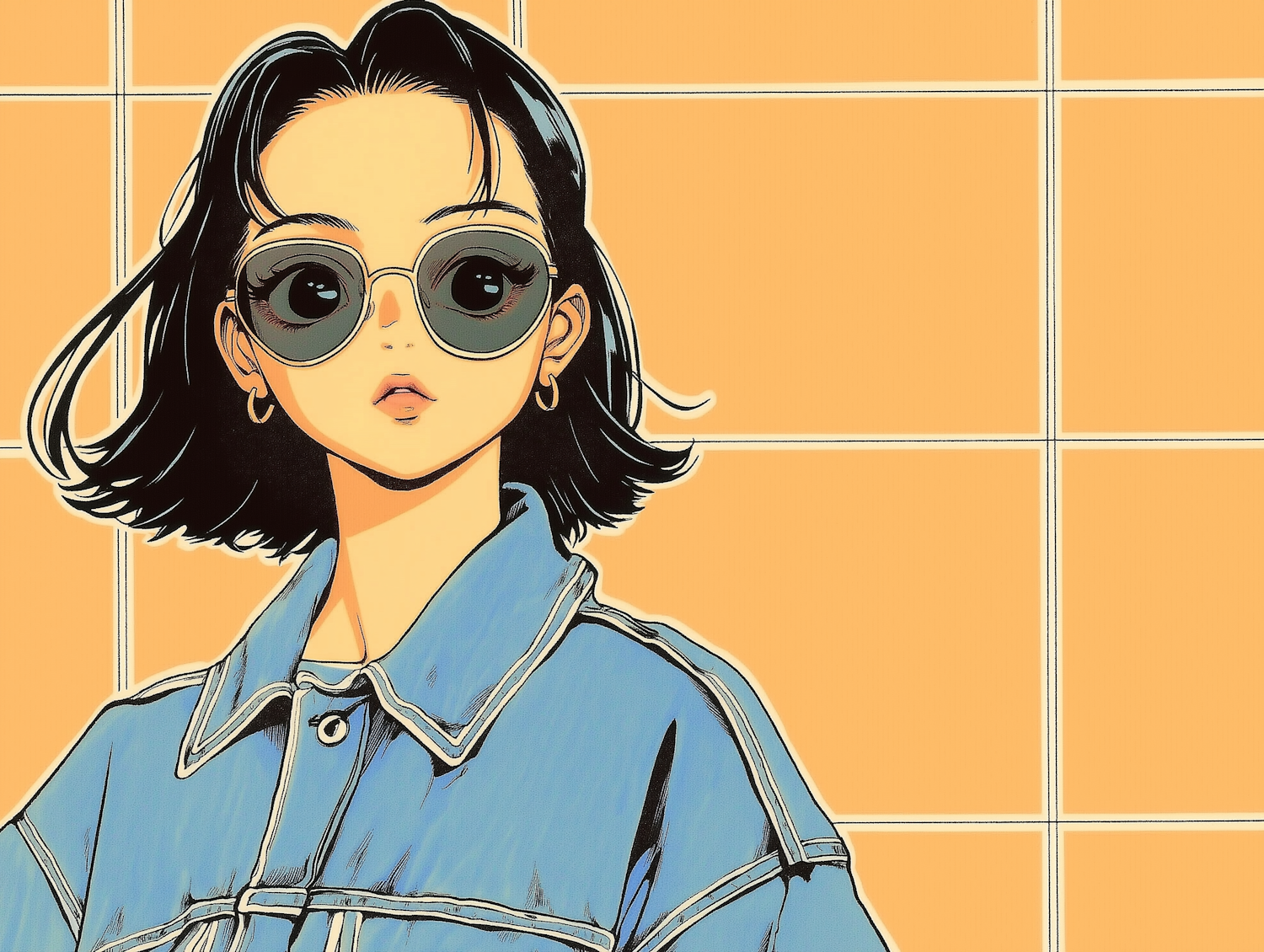 Chic illustration of a woman in sunglasses and denim jacket against an orange tiled background. Bold lines and vibrant colors.