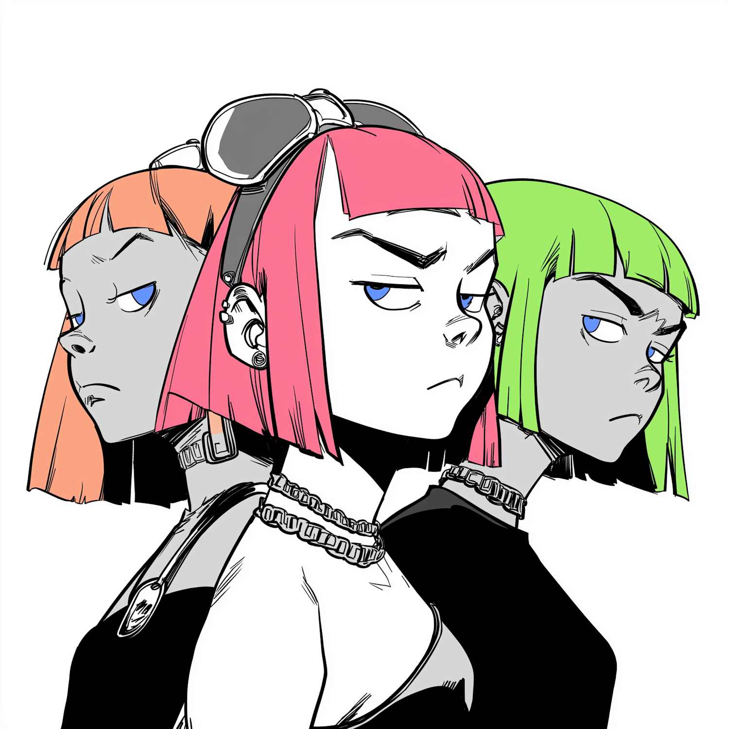 Stylized illustration of three women with bold hair colors, edgy accessories, and confident expressions against a white background.