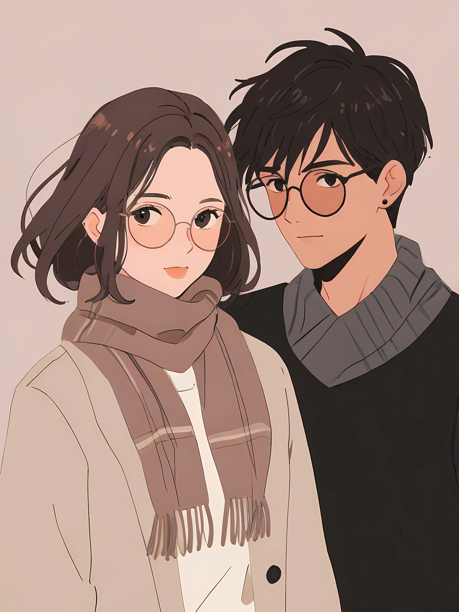 Charming illustration of two young adults in cozy autumn attire, featuring round glasses and warm expressions.